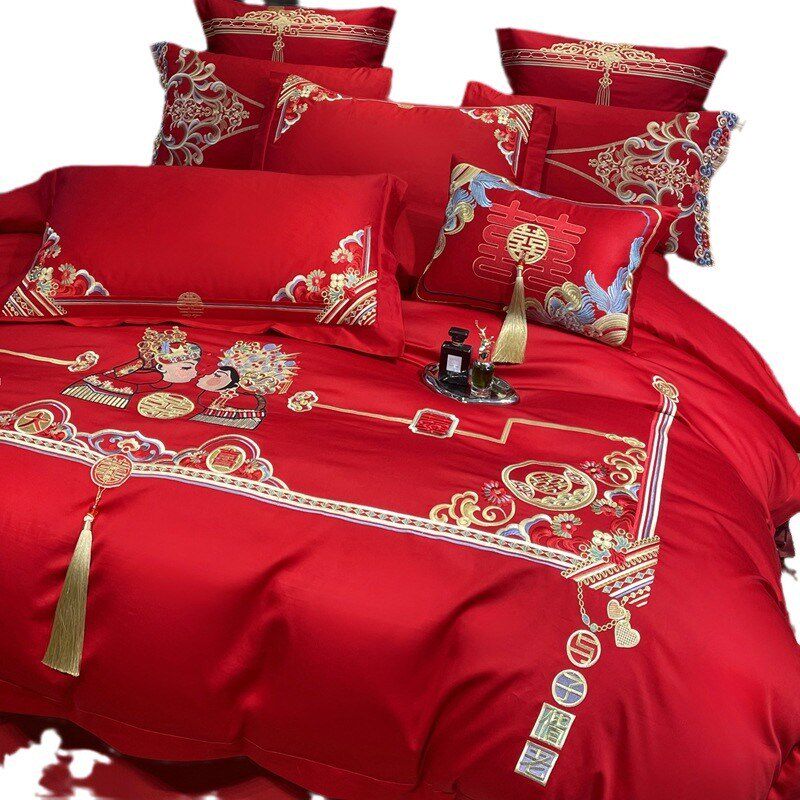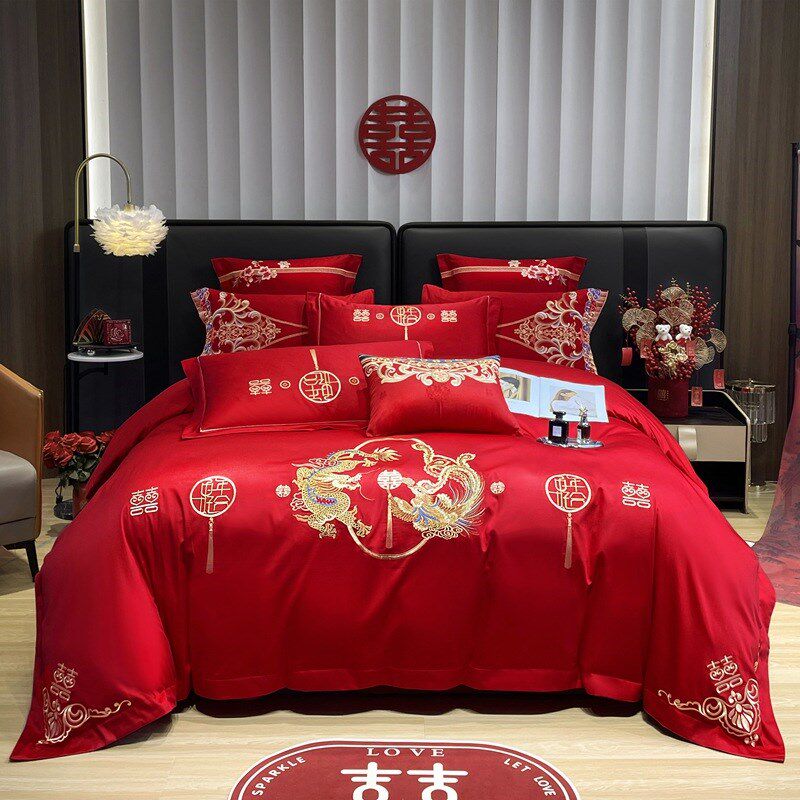 婚庆四件套红色龙凤刺绣新中式新婚陪嫁床单被套婚礼婚房床上用品