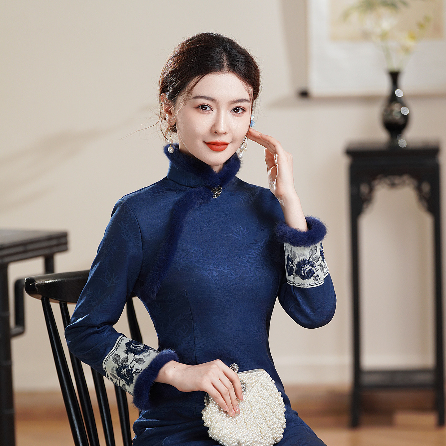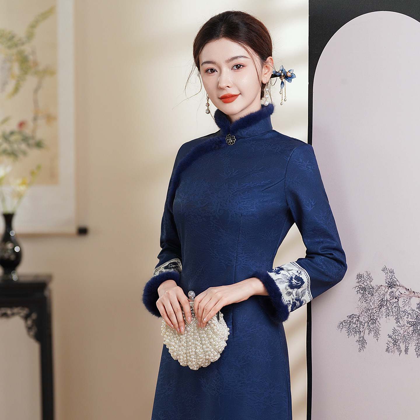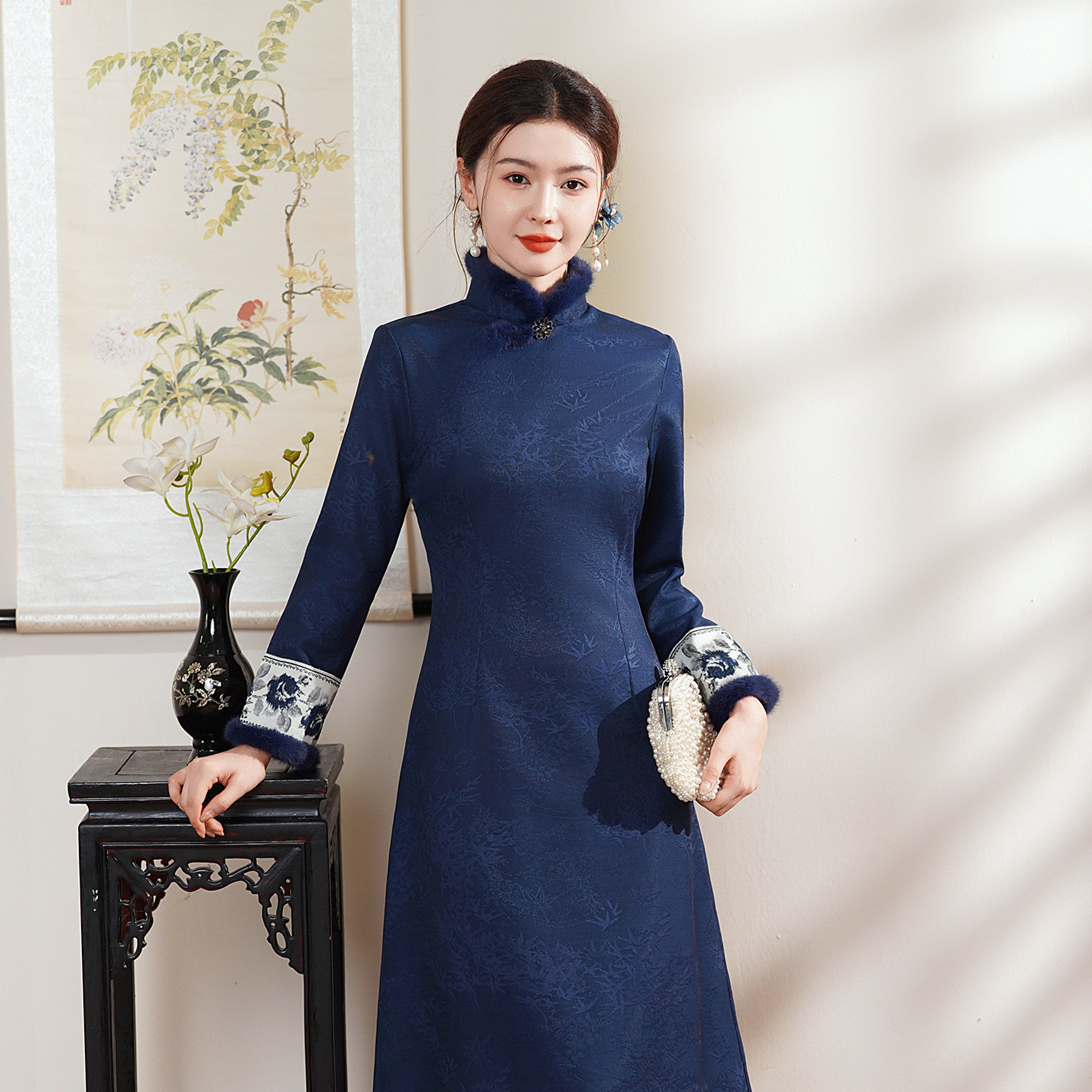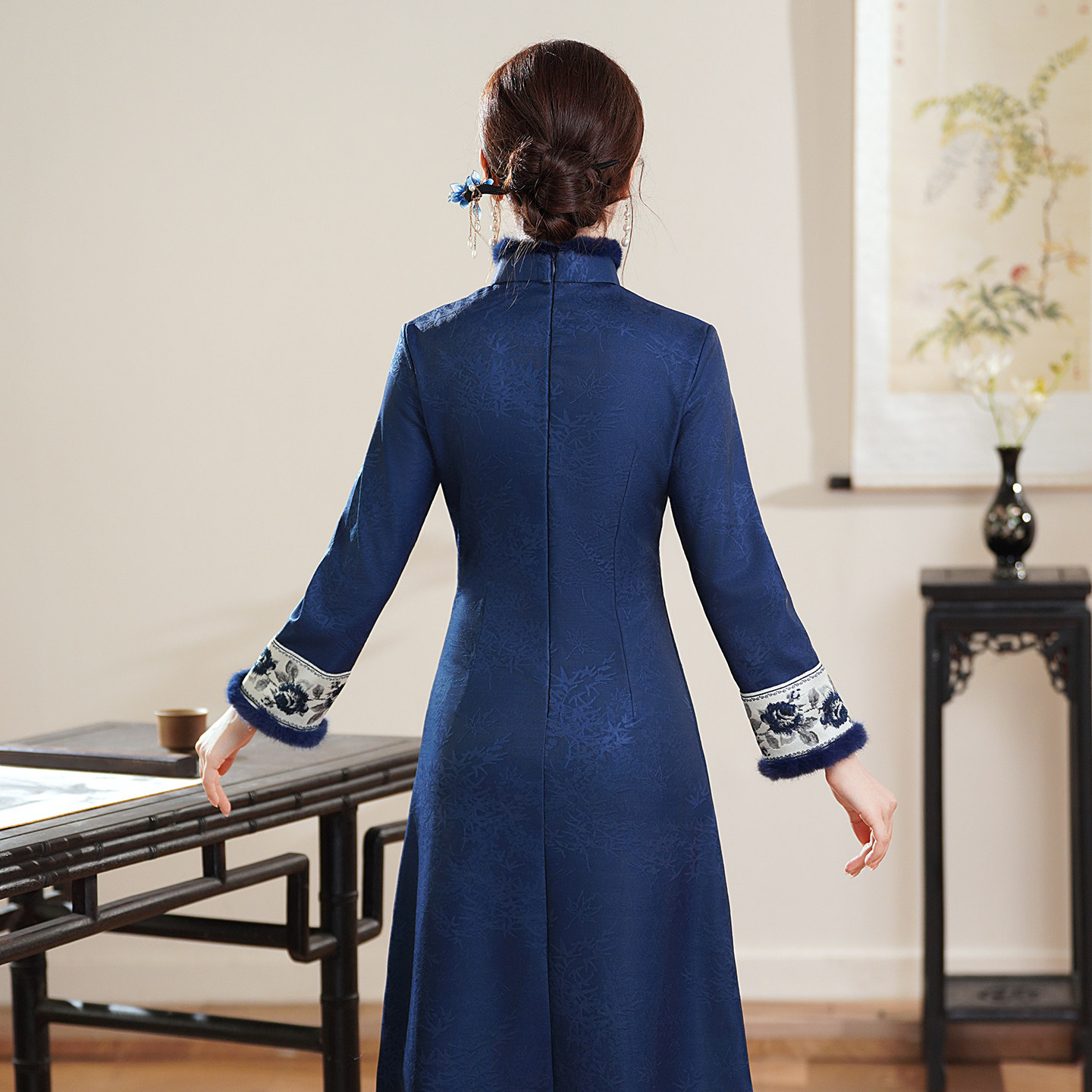 中国风蓝色长袖旗袍改良连衣裙高级立领刺绣保暖新中式年轻款女装