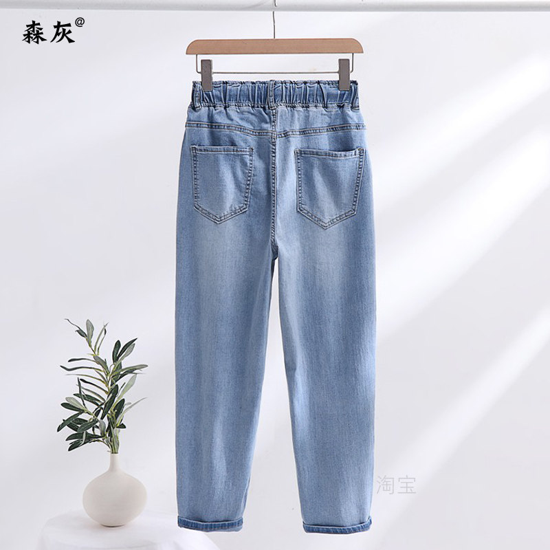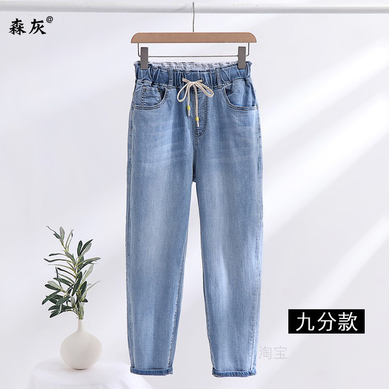 夏季薄款大码牛仔裤女松紧腰胖mm弹力高腰宽松梨形身材裤子哈伦裤