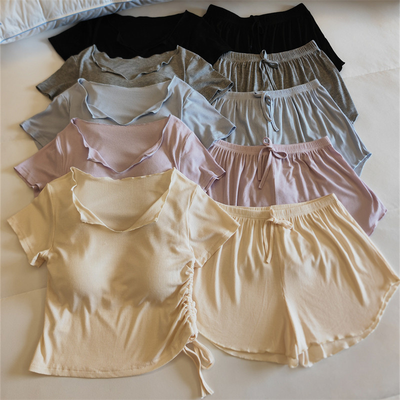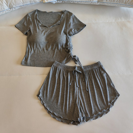 莫代尔带胸垫睡衣女夏季短袖短裤性感纯欲风长裤棉家居服套装网红
