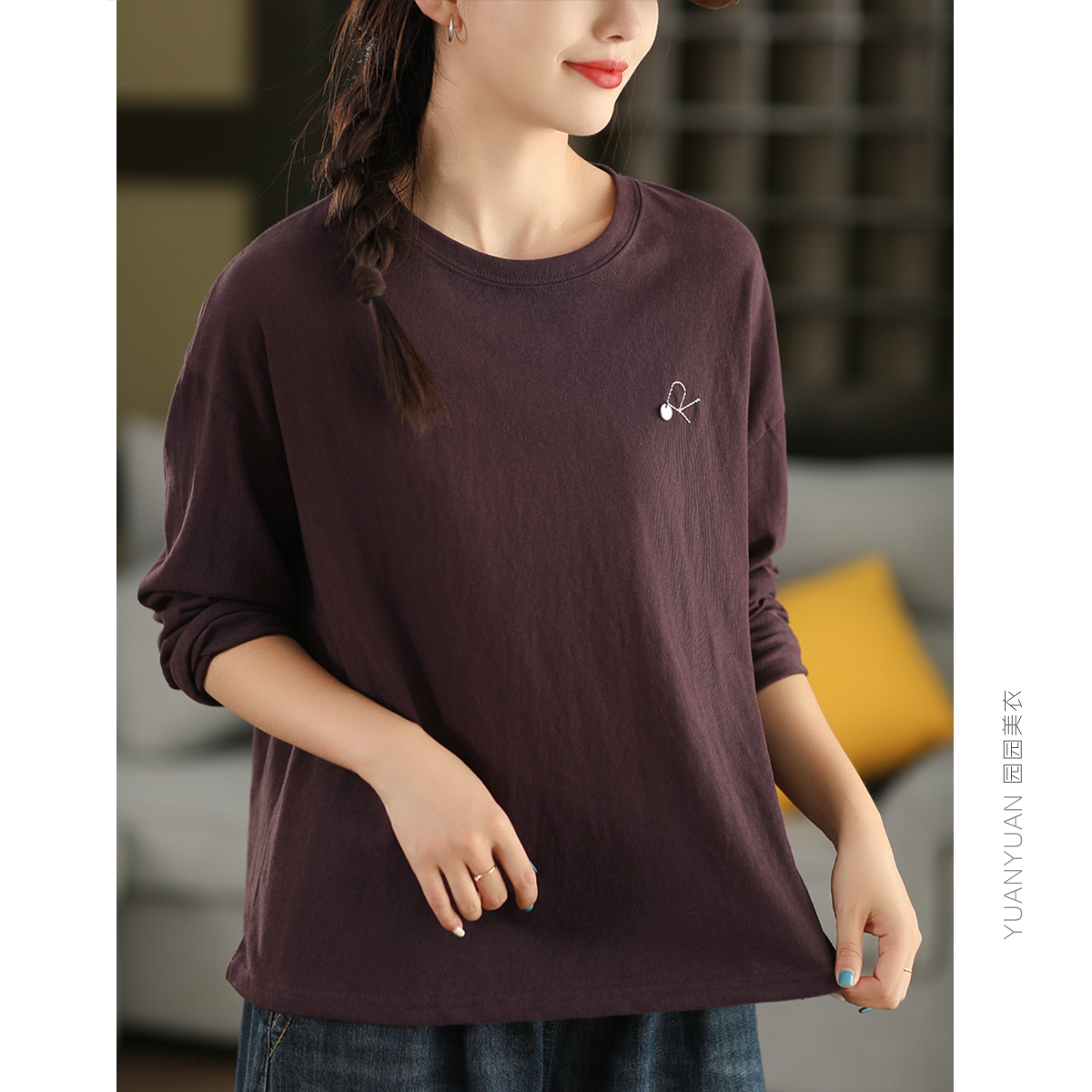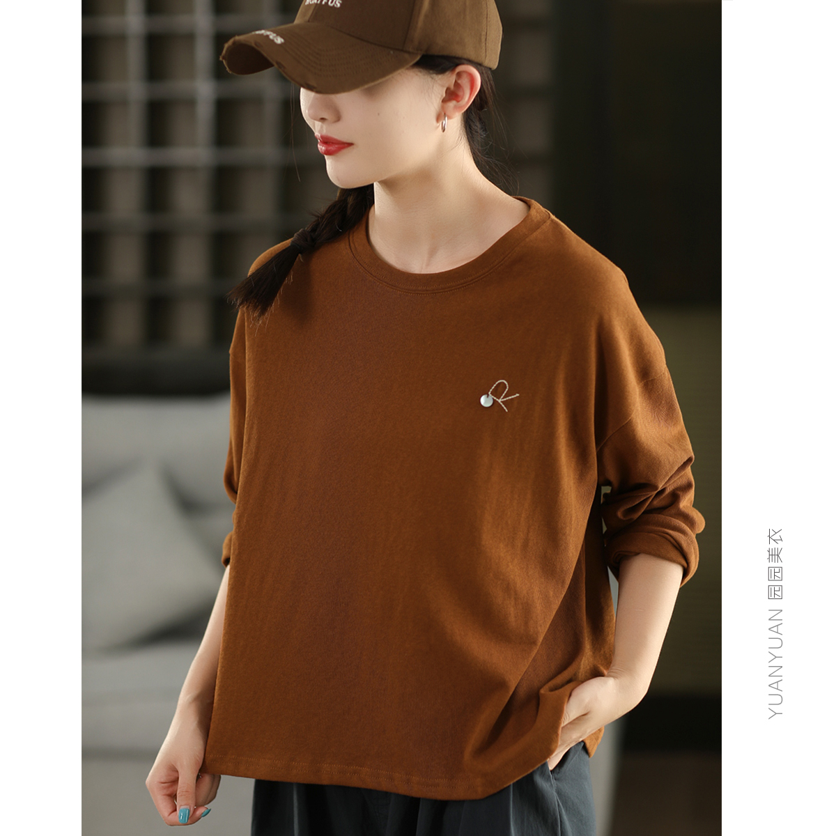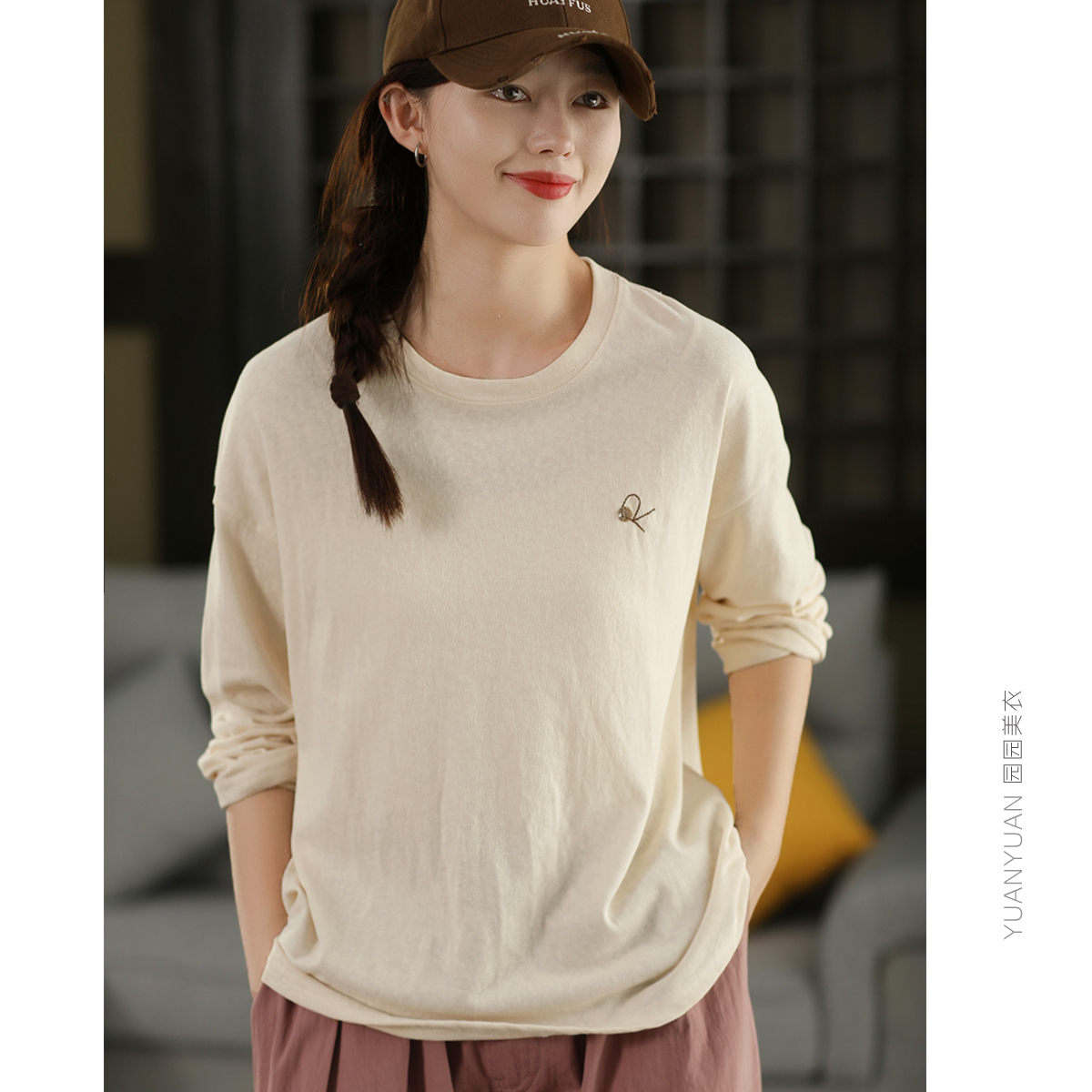 园园美衣早秋款麻感棉长袖上衣女宽松显瘦复古圆领套头衫文艺T恤