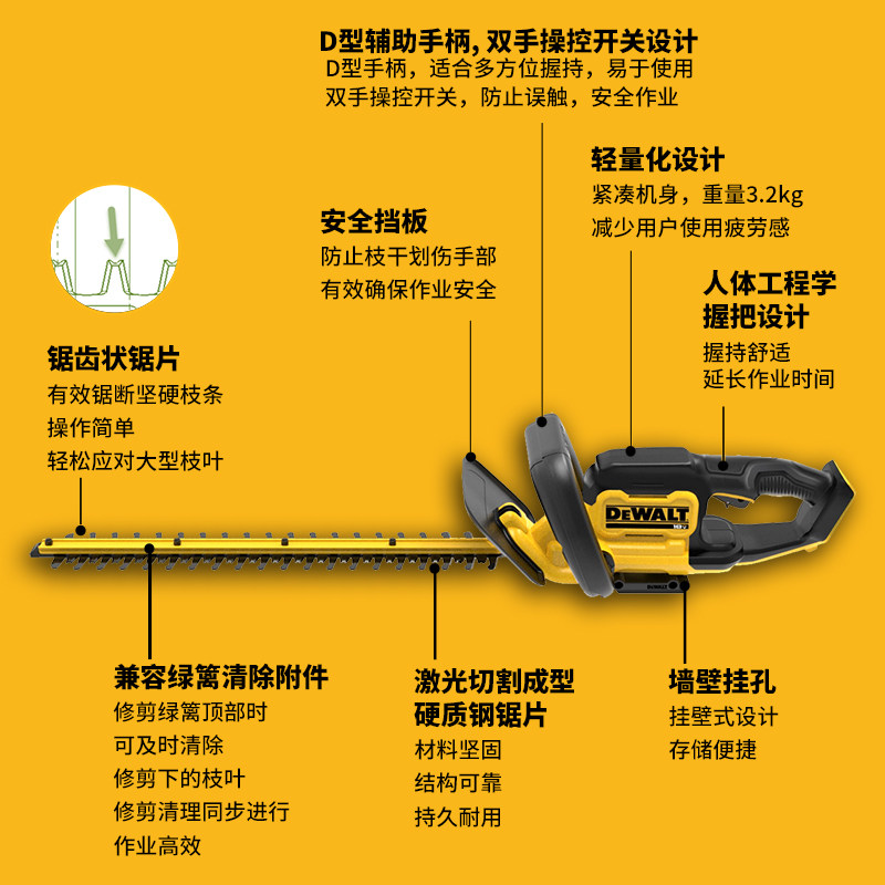 得伟18/20V充电式锂电无线绿篱机DCMHT564篱笆修剪机55CM园林修剪