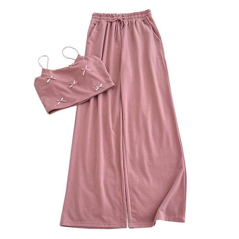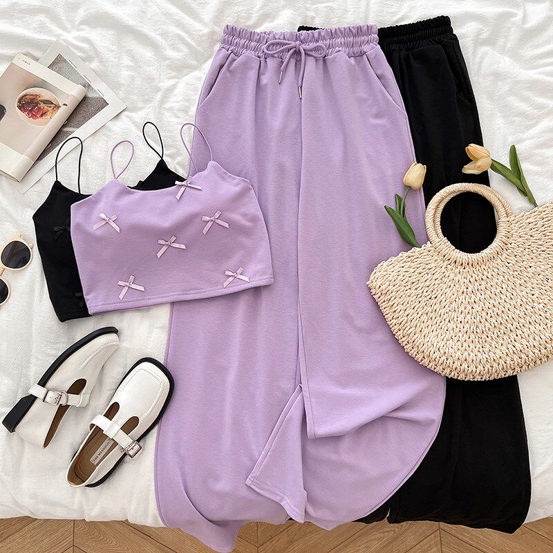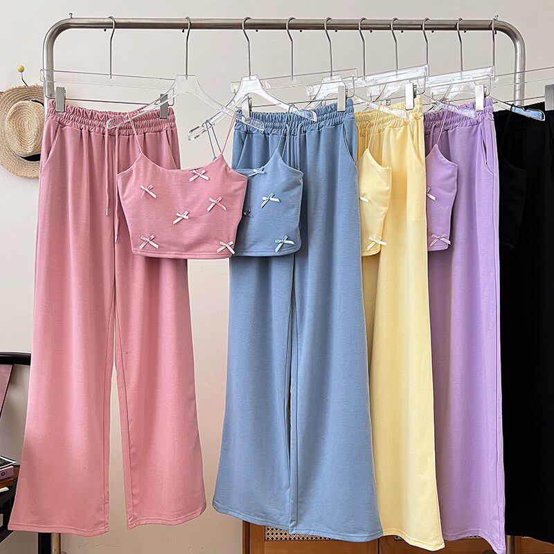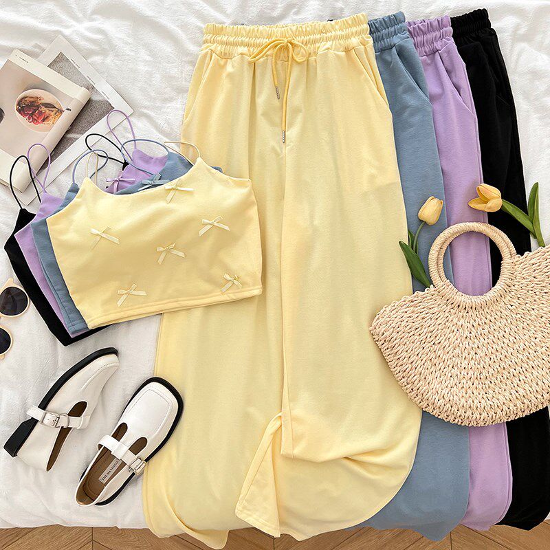 立体蝴蝶结吊带背心上衣+高腰显瘦阔腿裤休闲裤直筒裤两件套女夏