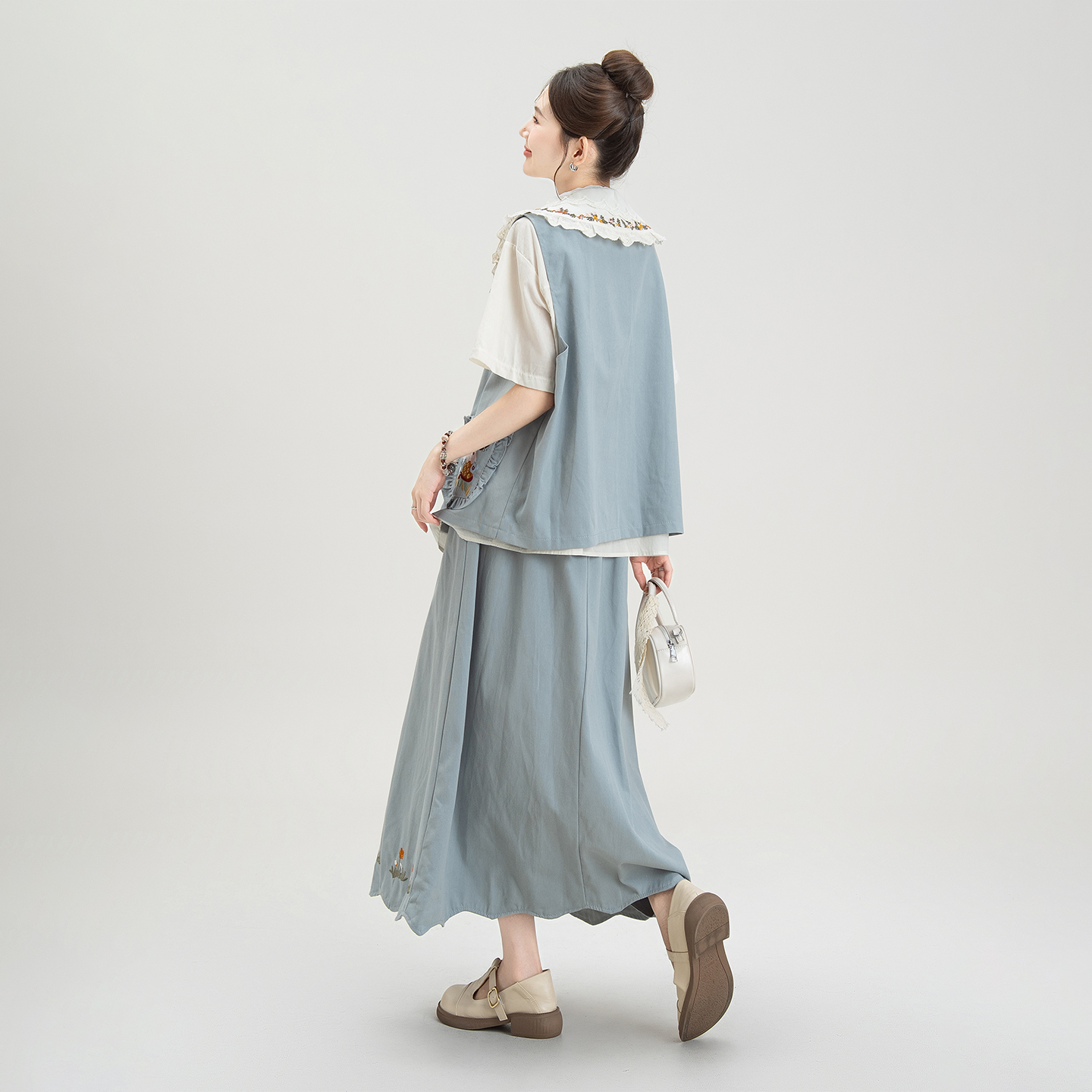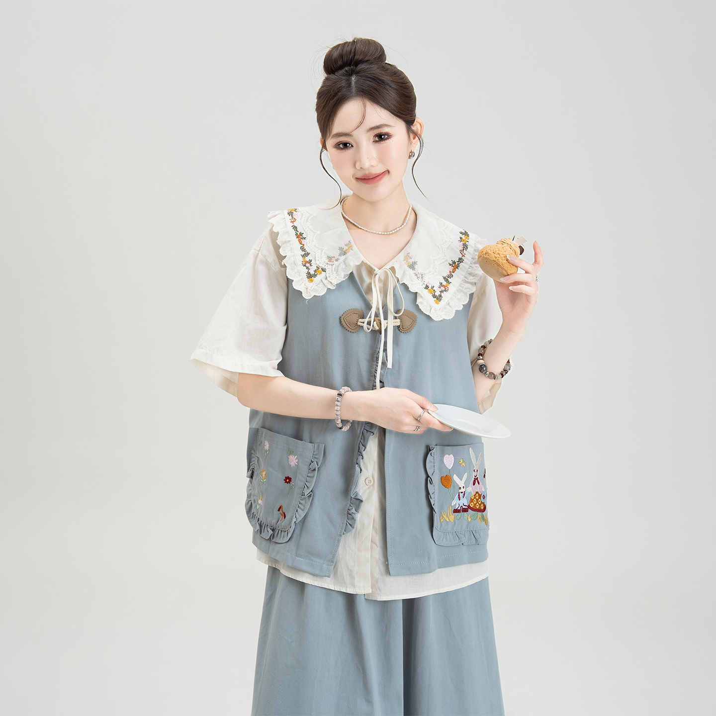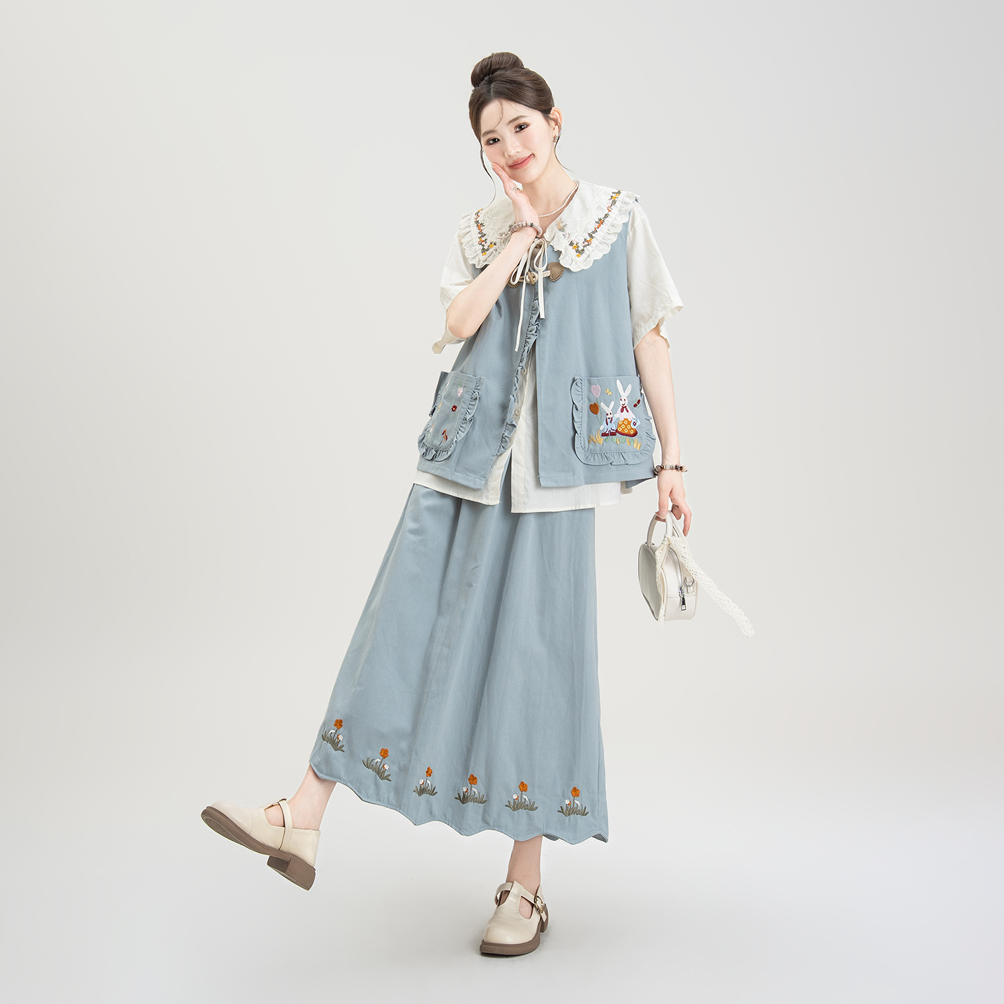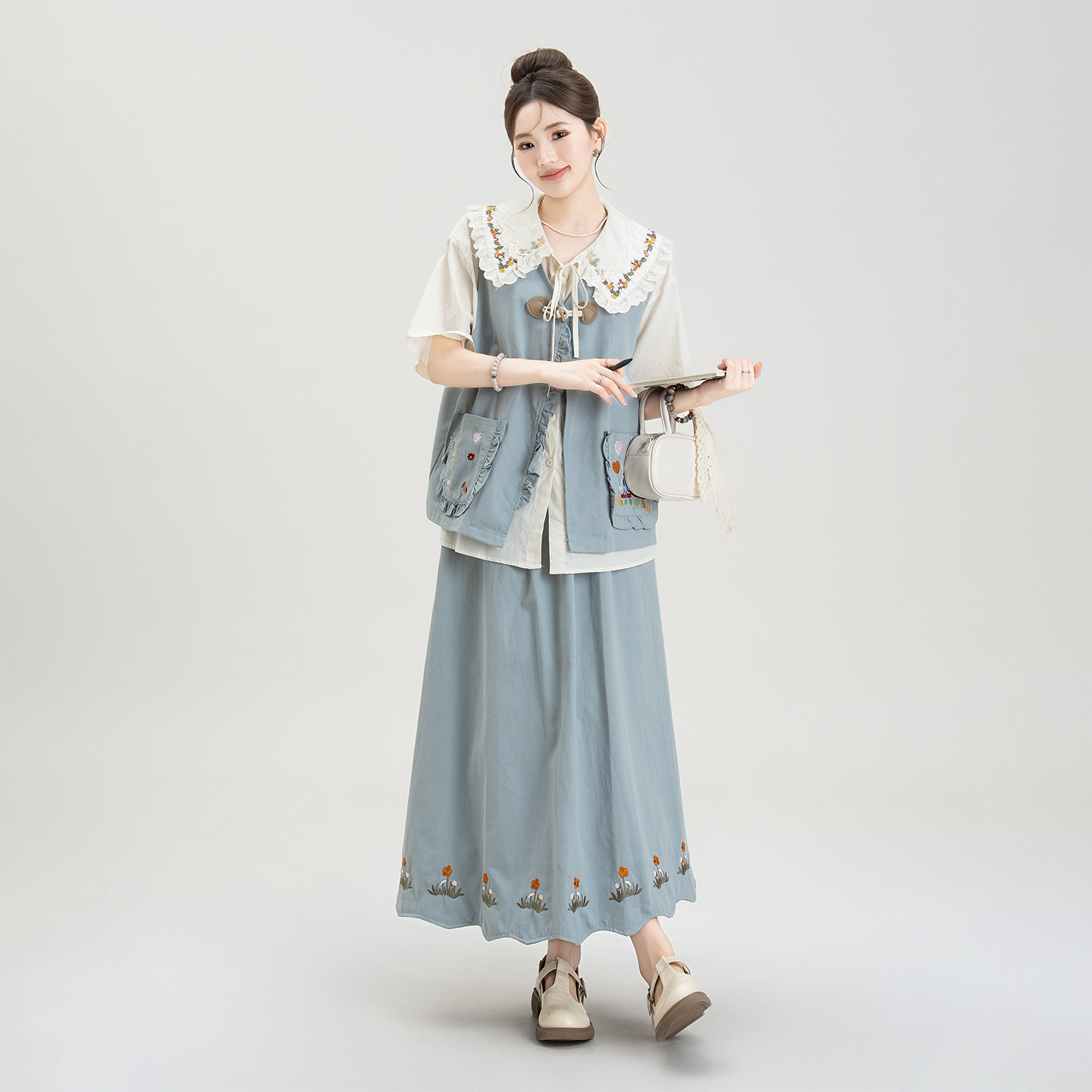 蓝色娃娃领短袖衬衫女夏季新款蕾丝刺绣牛仔马甲半身裙子三件套装