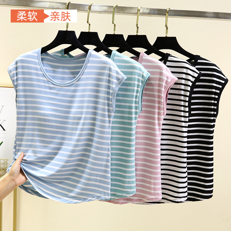 圆领条纹无袖t恤上衣女夏季薄款莫代尔免文胸打底衫大码套头汗衫