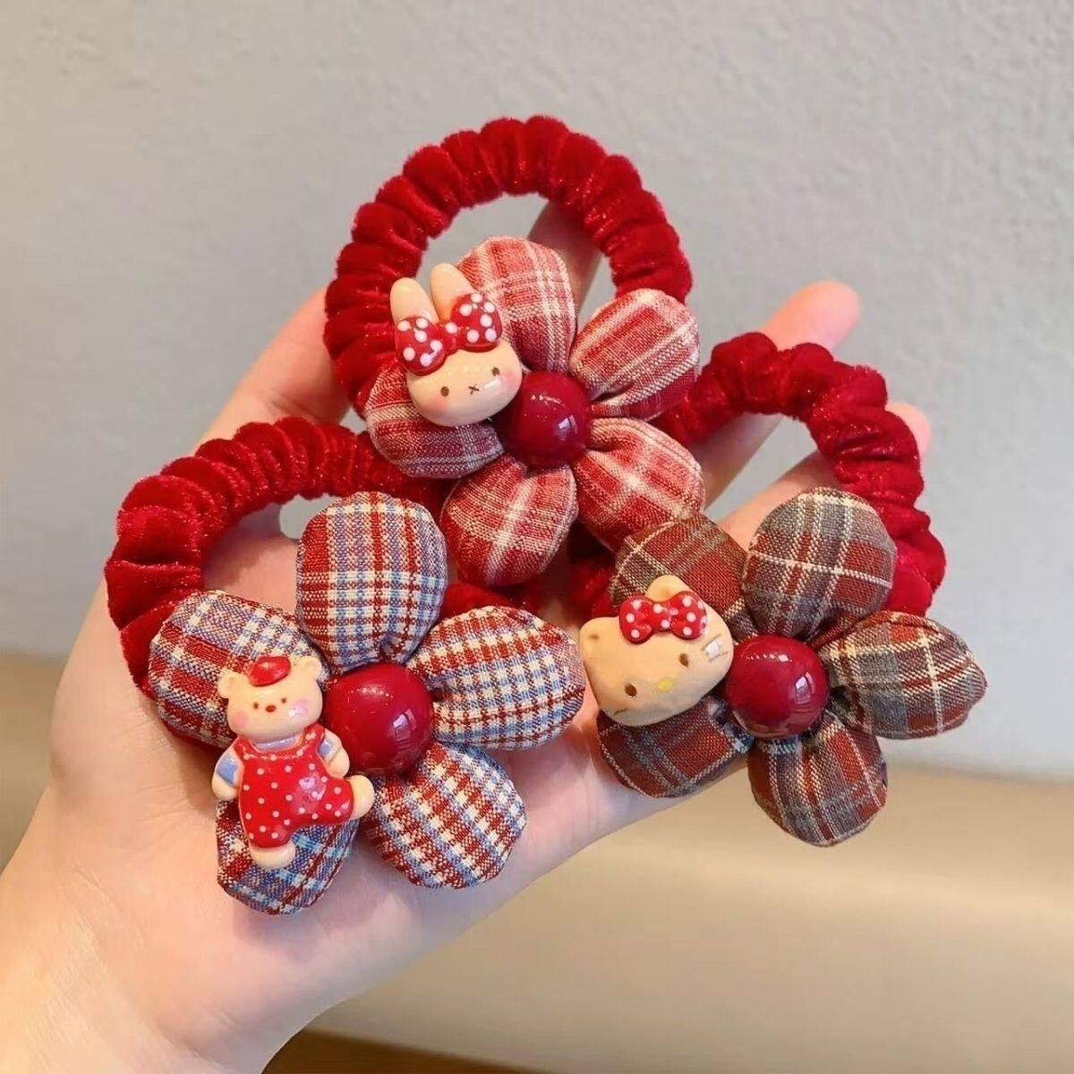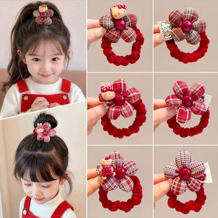 红色格纹花朵发圈儿童秋冬植绒扎发绳可爱卡通丸子头皮筋女童发饰