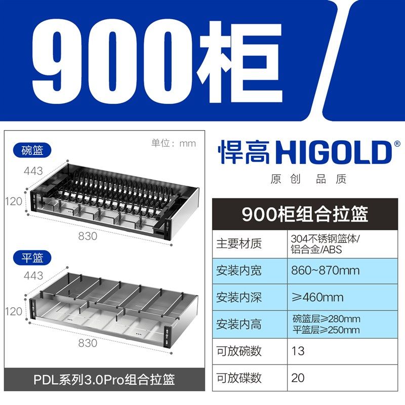 悍高PDL3.0橱柜拉篮抽屉式304不锈钢厨房碗碟拉篮碗架双层碗篮