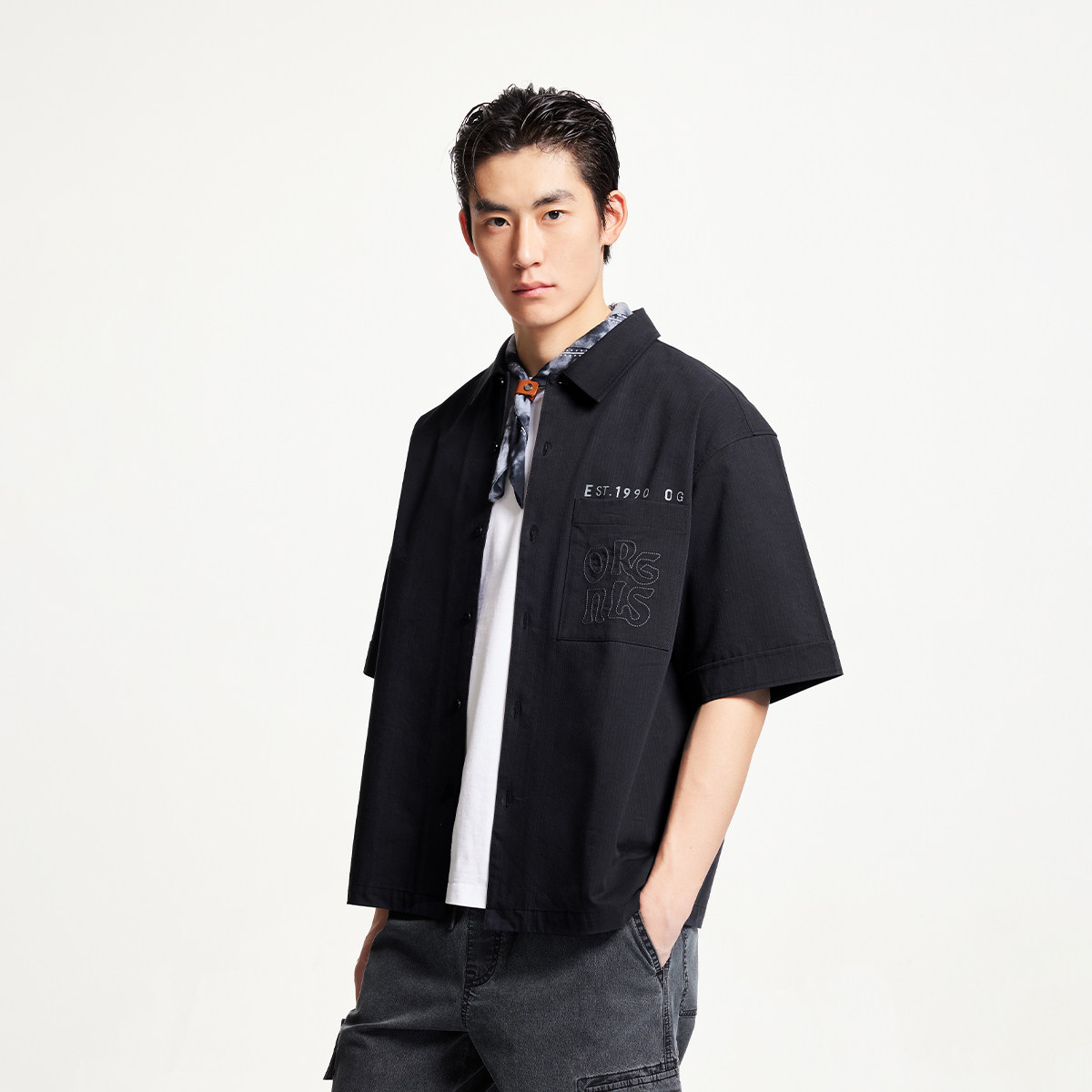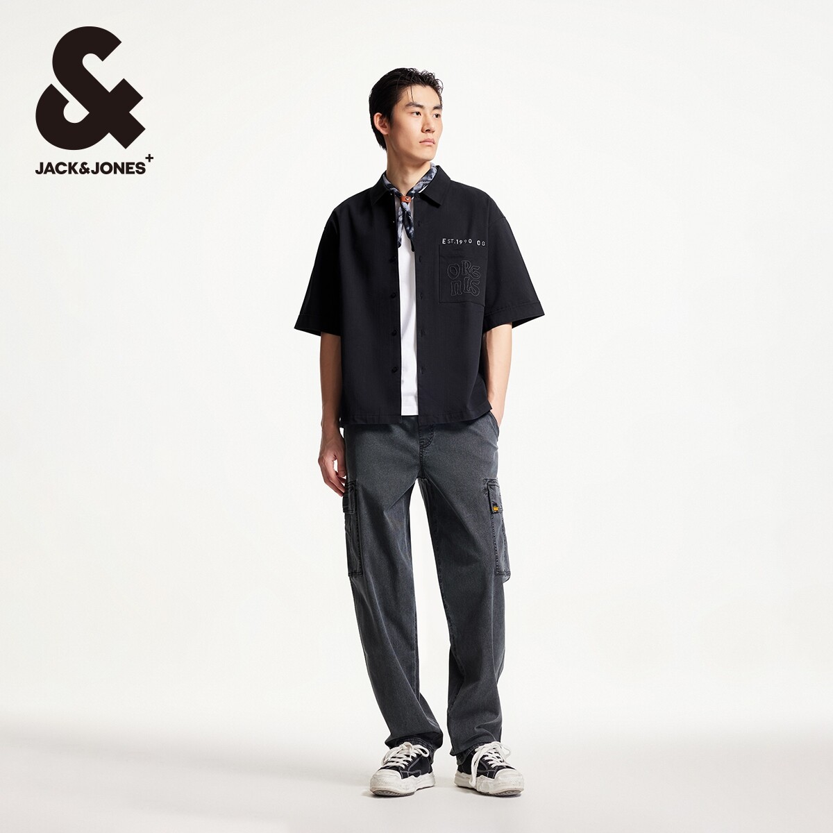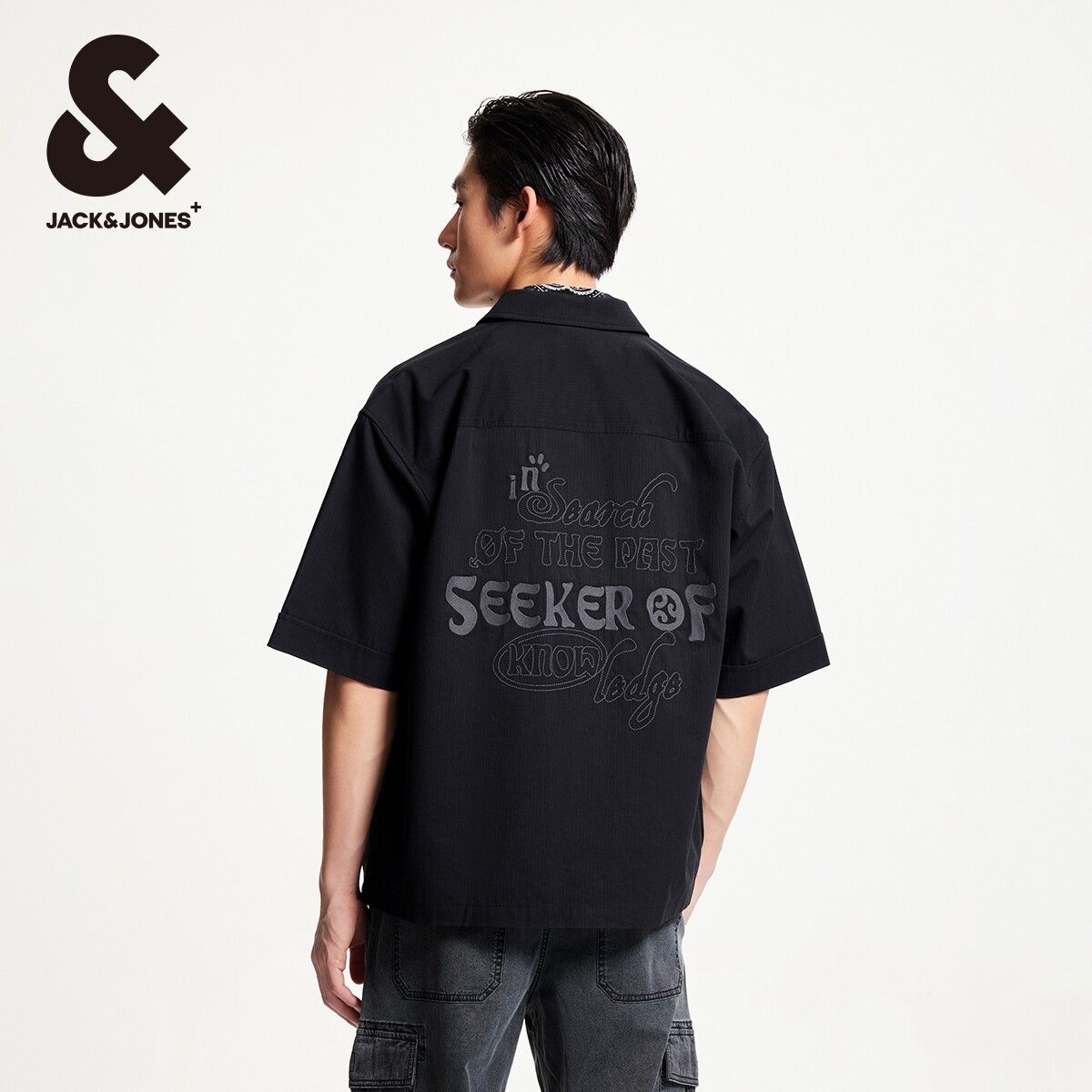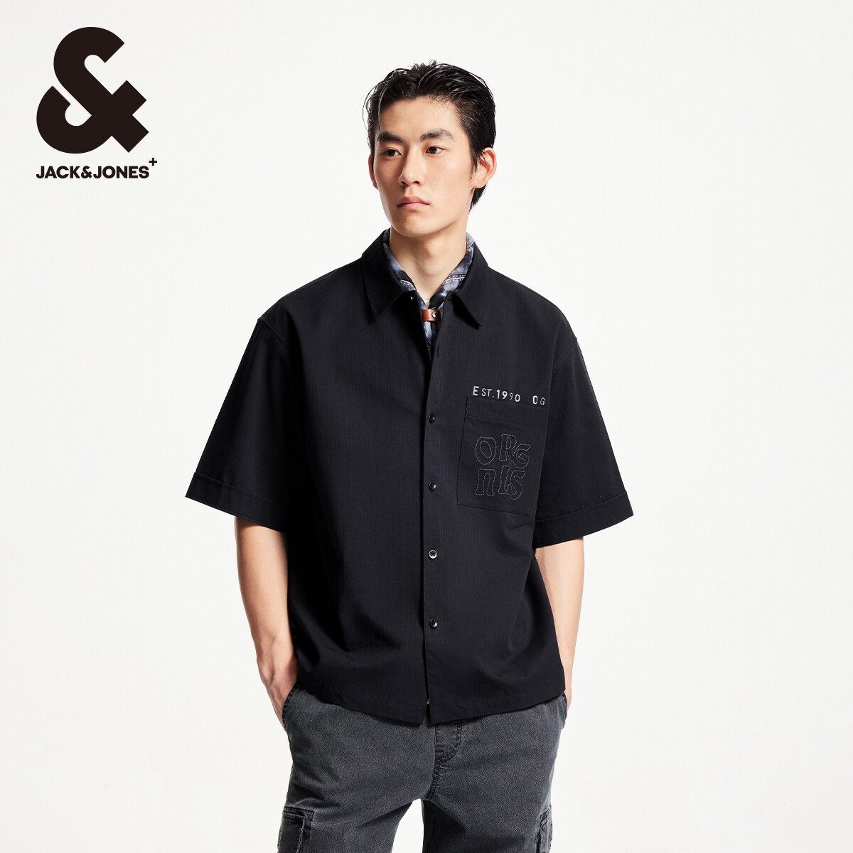 杰克琼斯夏季奥莱潮流宽松纽扣翻领刺绣图案装饰短袖衬衫上衣男装