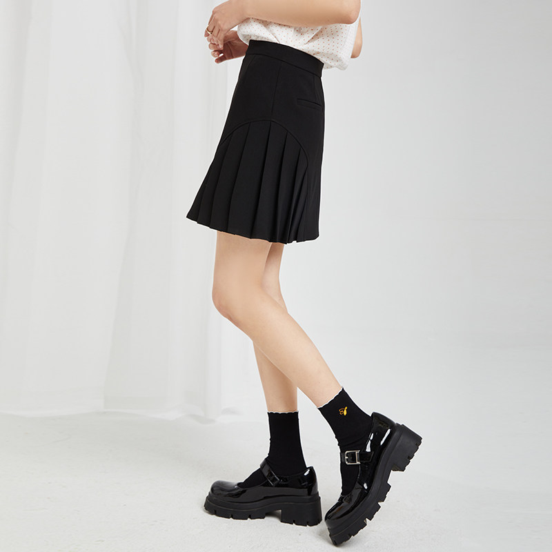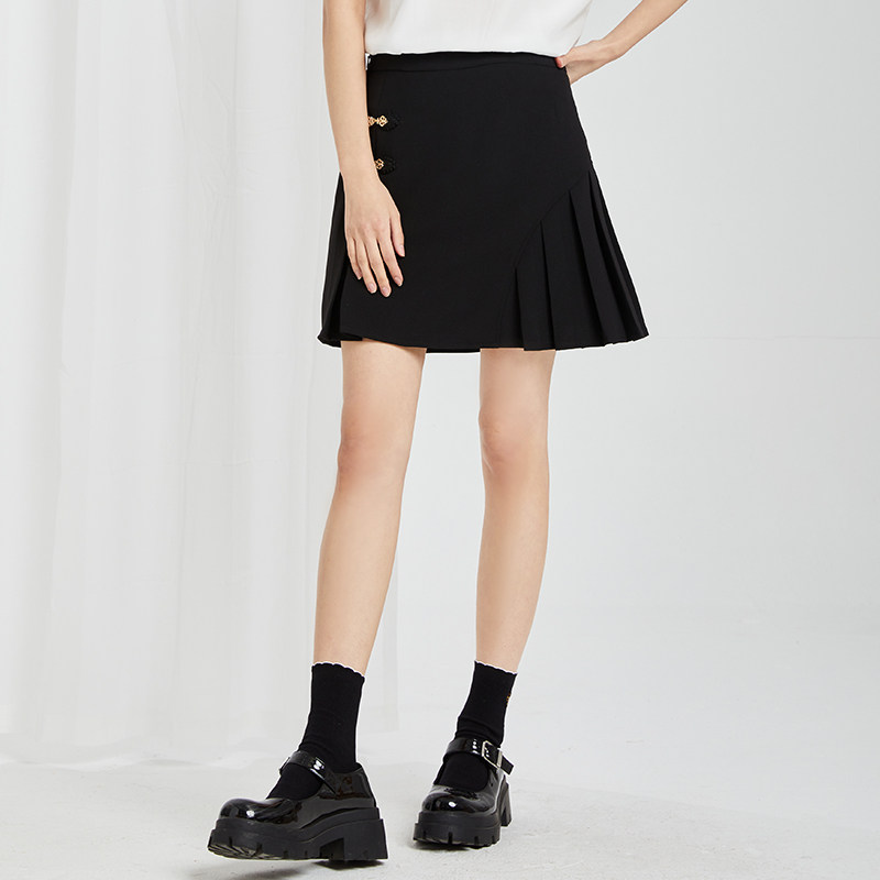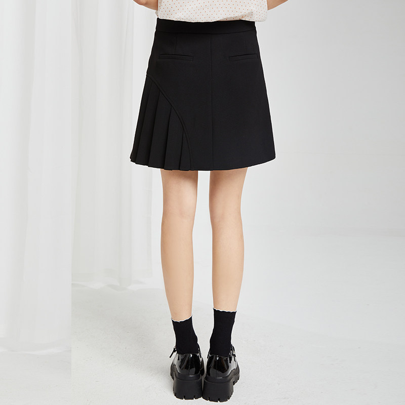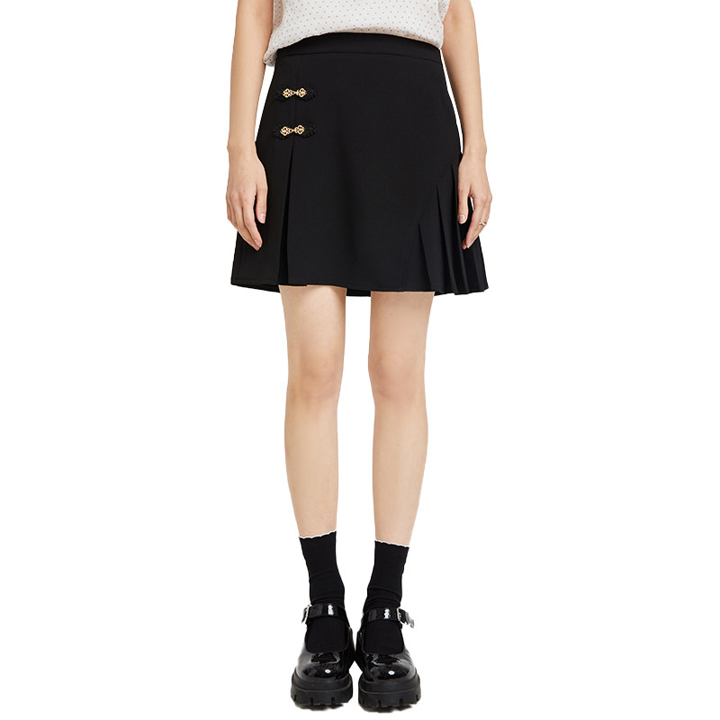 金苑裙子女夏季新款黑色时尚气质设计感百褶a字半身裙B222109