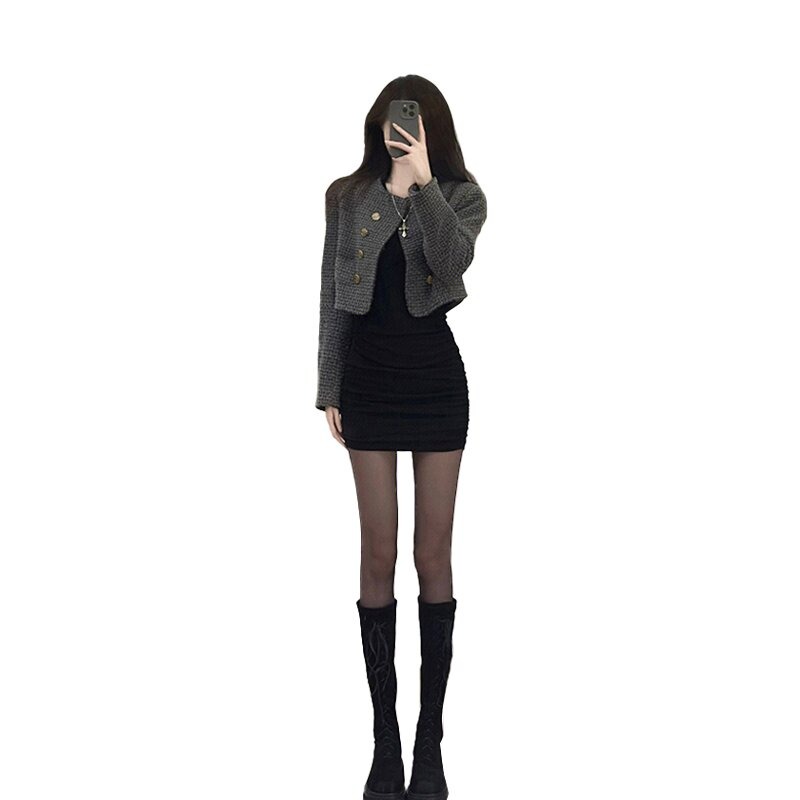 纯欲性感黑色V领长袖连衣裙女秋季内搭新款辣妹风修身包臀短裙子
