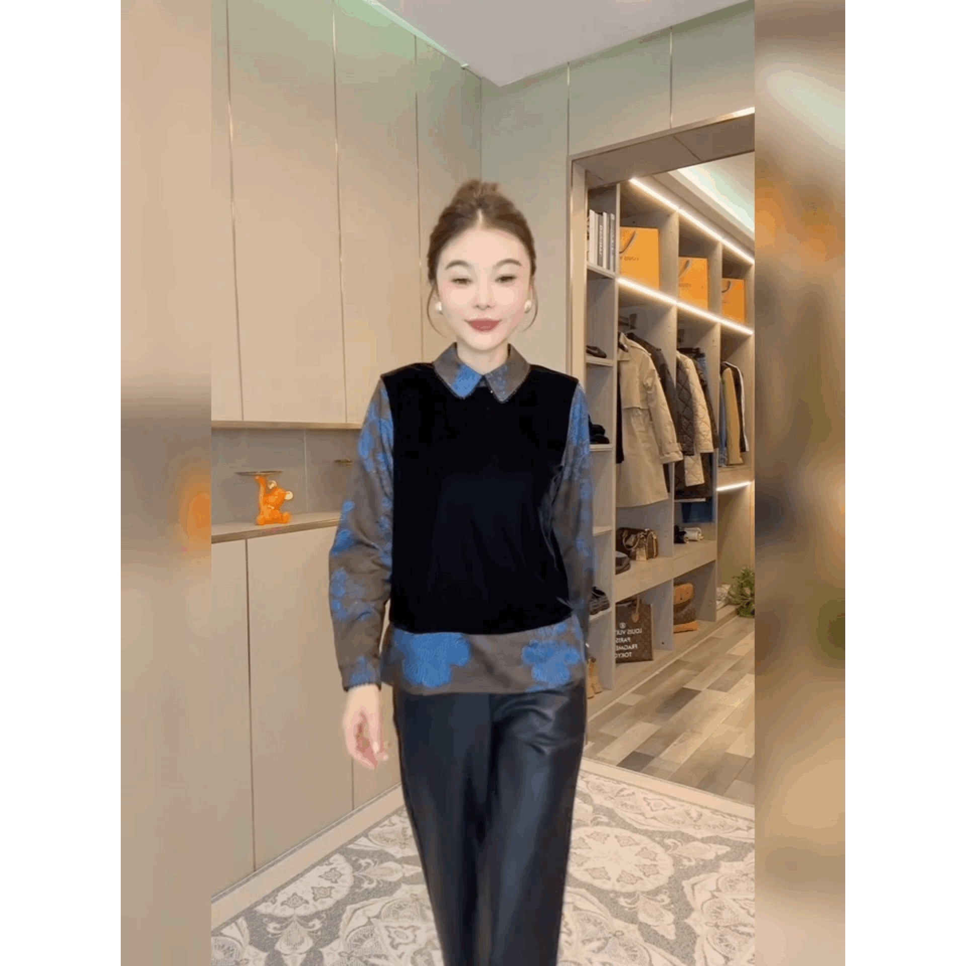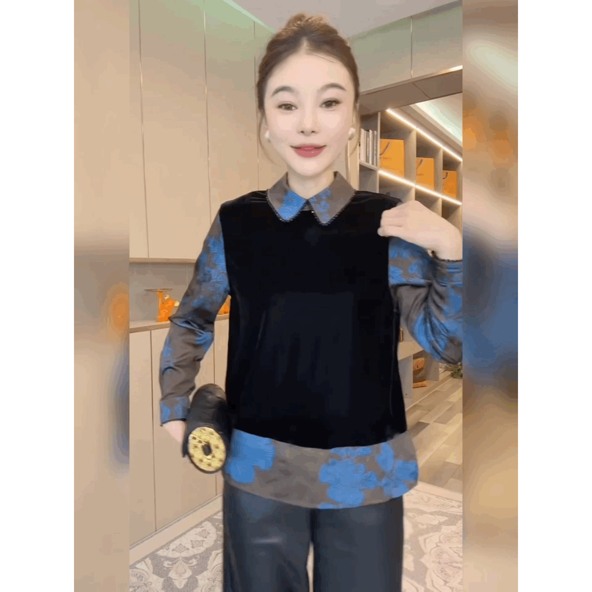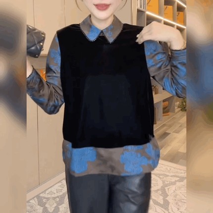 复古国风小众印花衬衫丝绒假两件