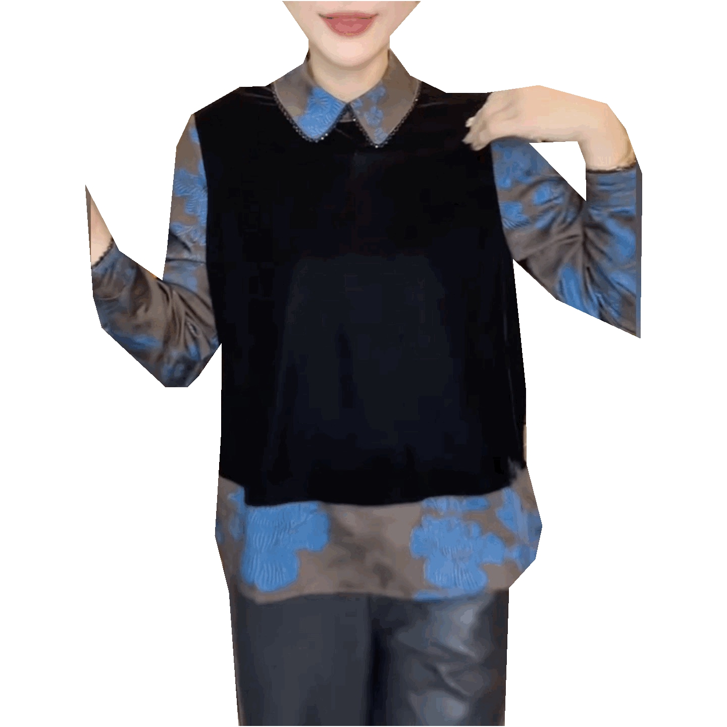 气质翻领丝绒衬衫女假两件丝绒拼接雪纺打底衫显瘦长袖法式上衣潮