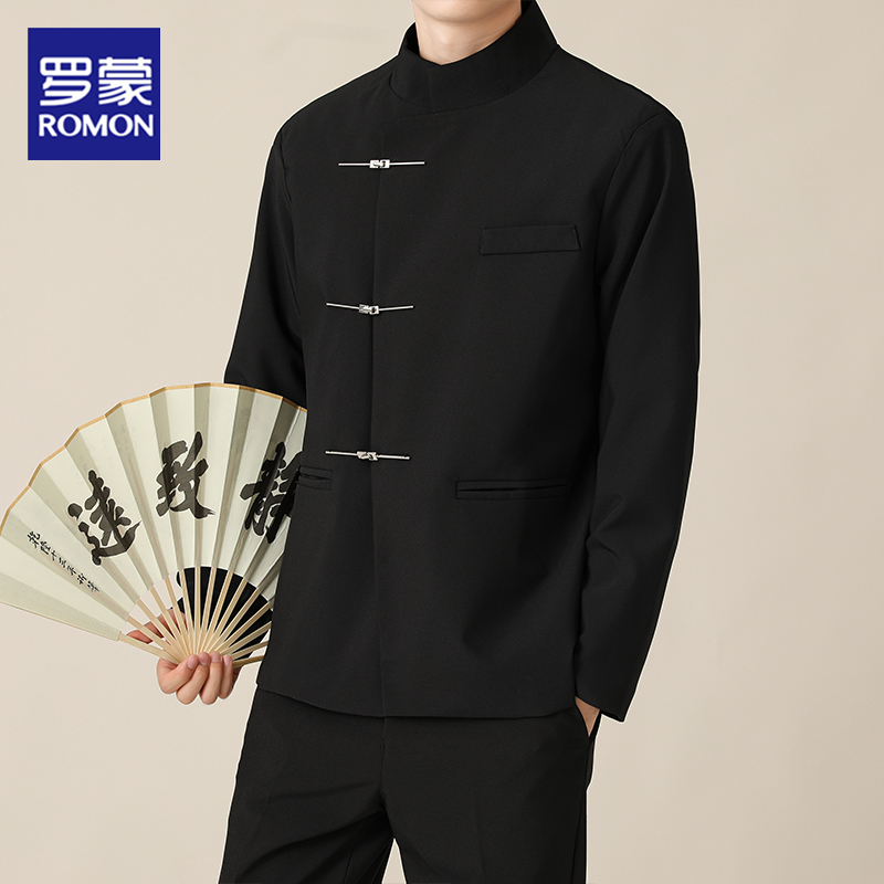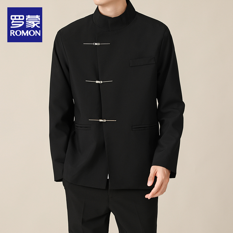 罗蒙国潮牌黑色新中式西装男士春秋新款中国风中山装立领西服外套