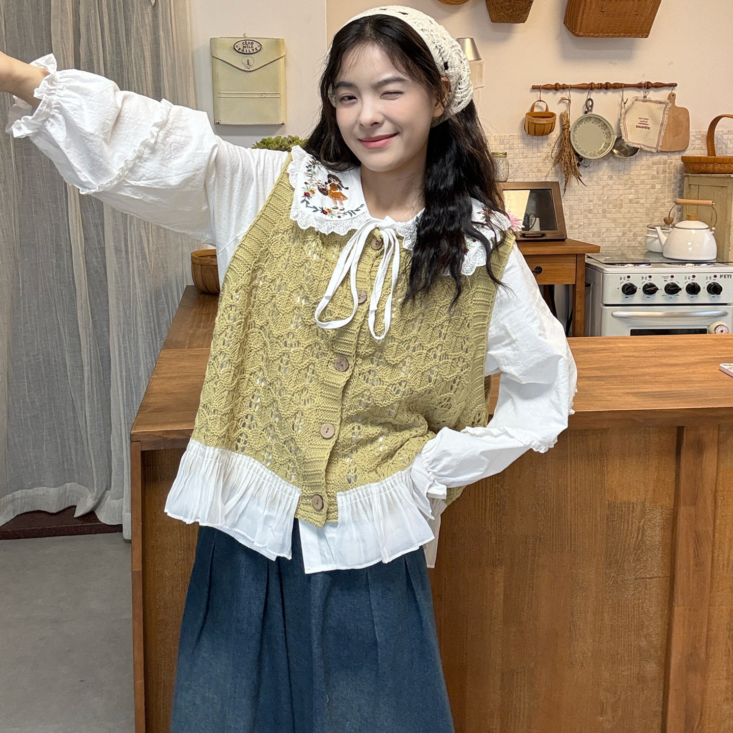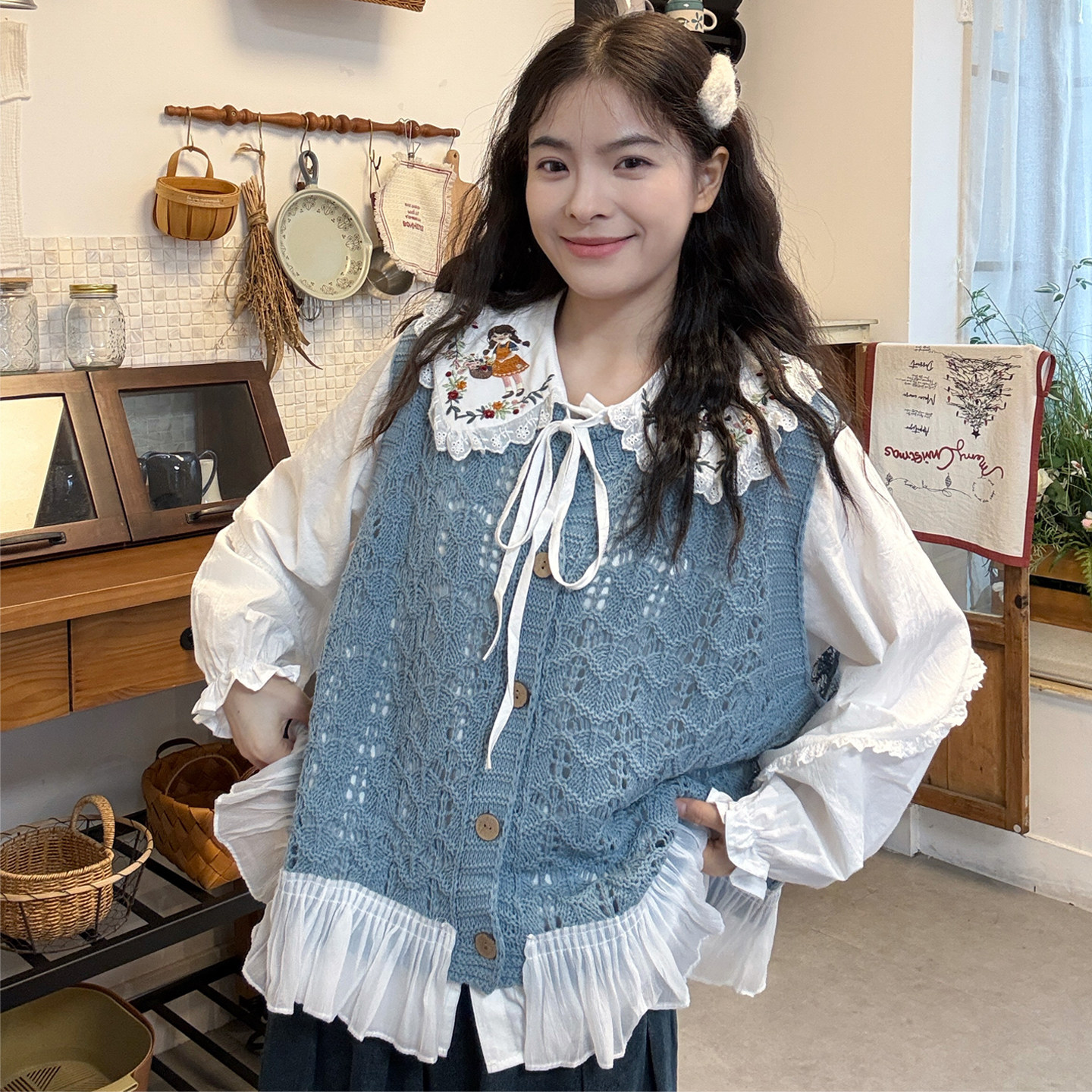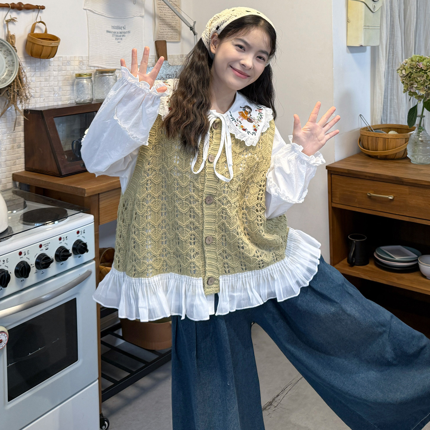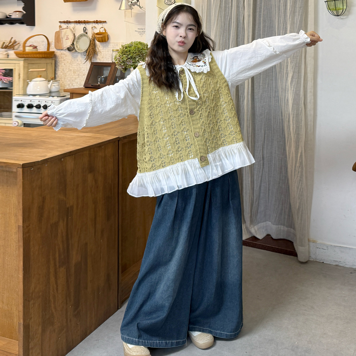娃娃领刺绣衬衫+针织马甲+牛仔裤