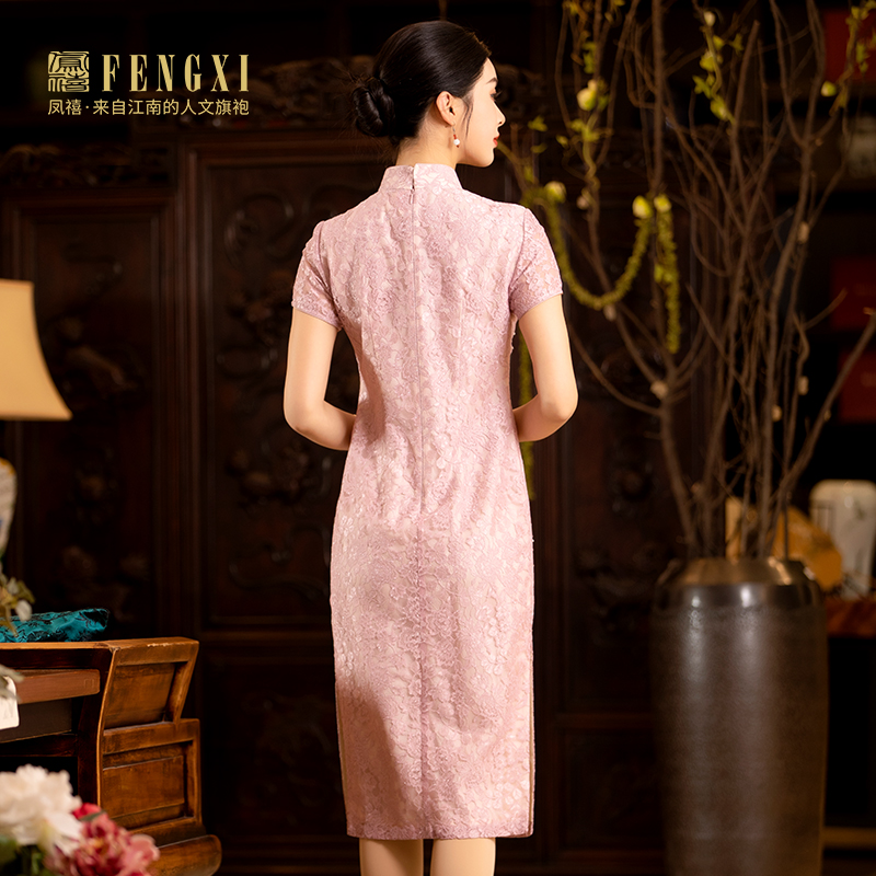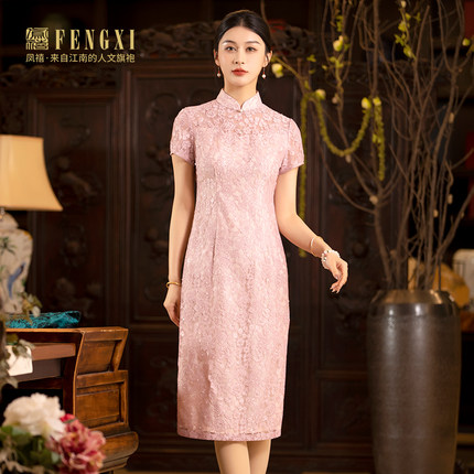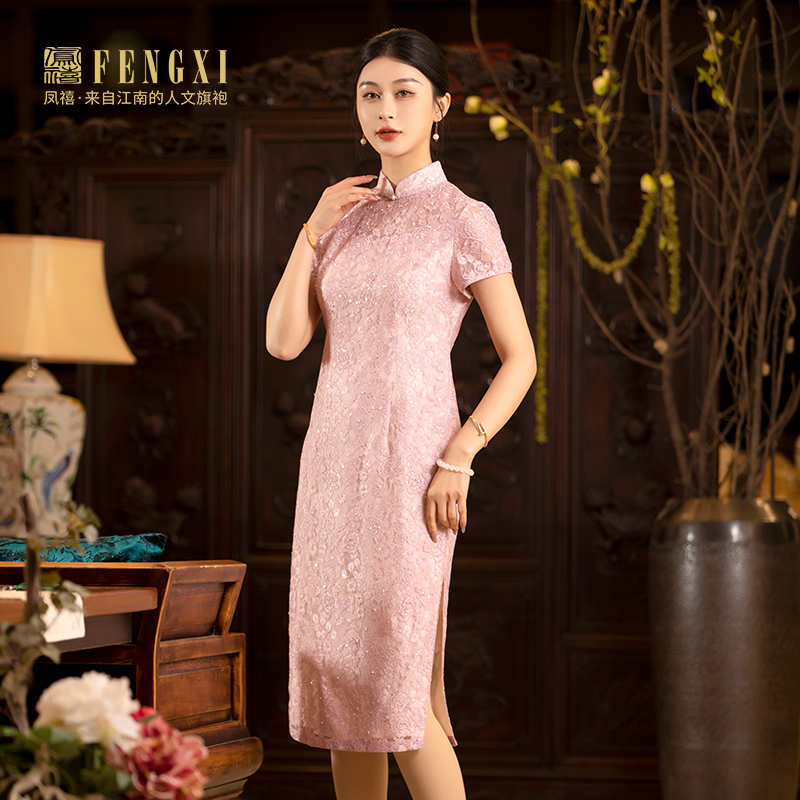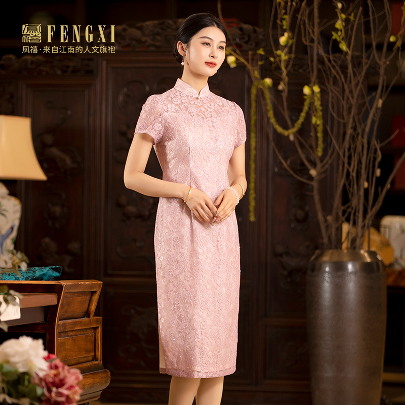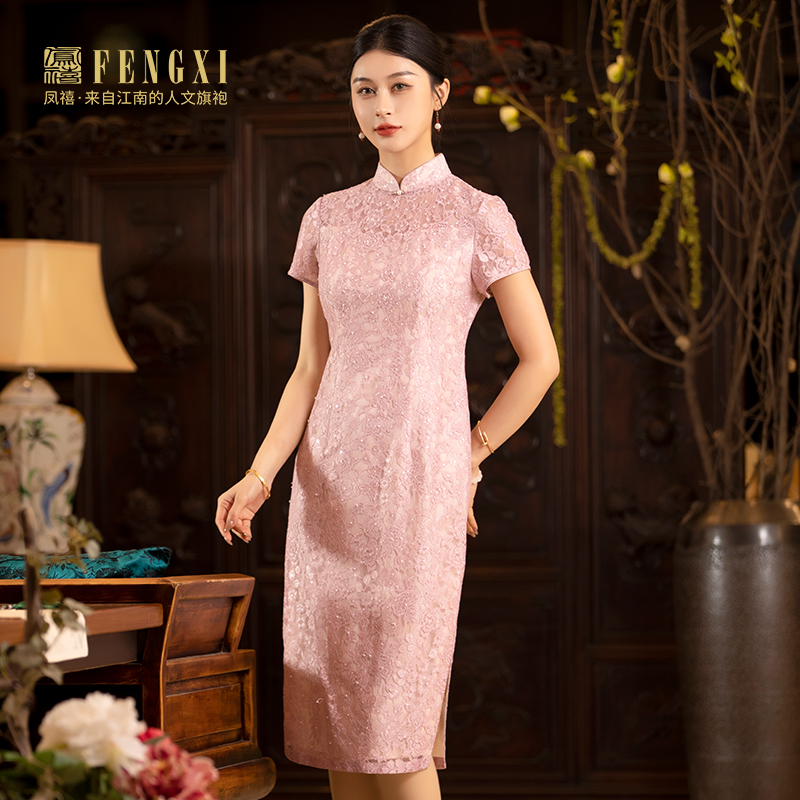 凤禧粉紫色蕾丝日常聚会订婚改良旗袍裙礼服年轻款2025新款夏季女