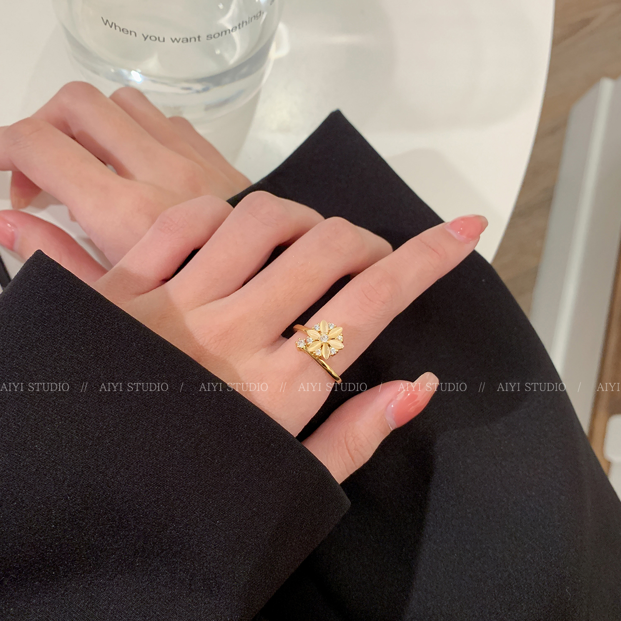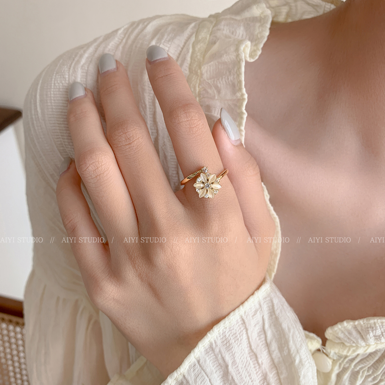 猫眼石花朵旋转戒指食指戒