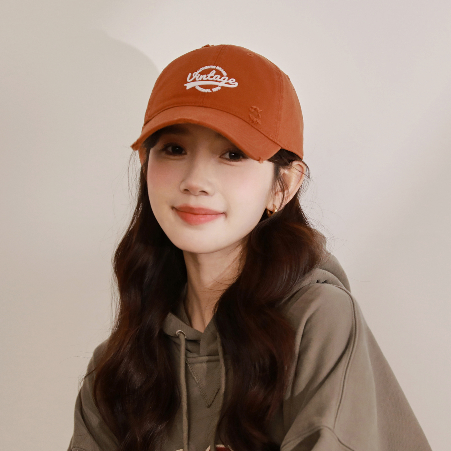 美式复古棒球帽男女夏季磨破做旧显脸小软顶鸭舌帽脏橘色弯檐帽子