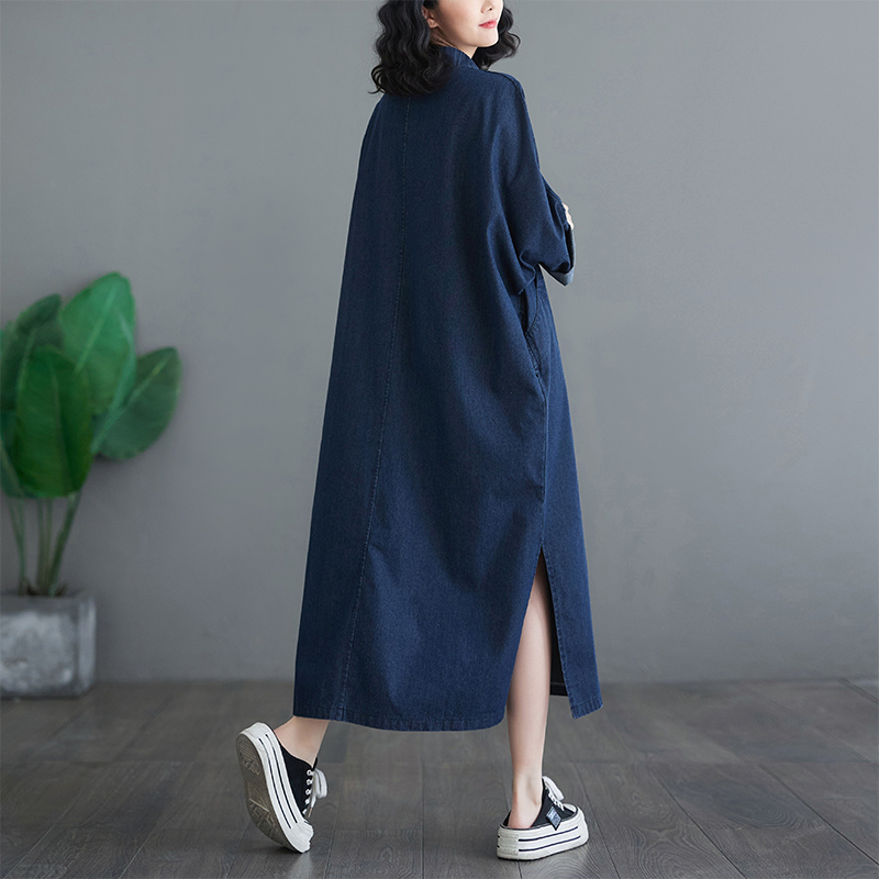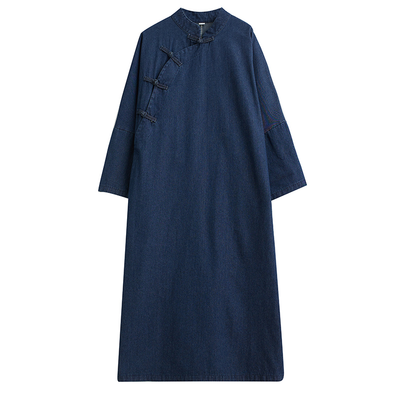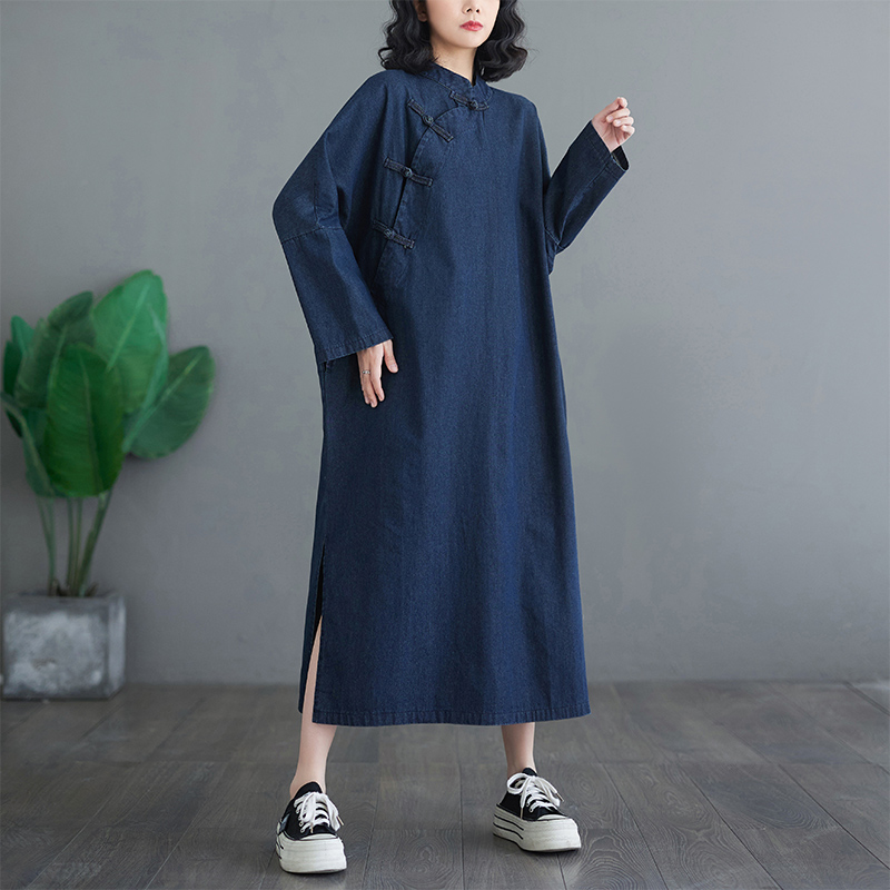 文艺复古盘扣牛仔连衣裙袍子民族中长款长袖蓝色过膝加大码裙子