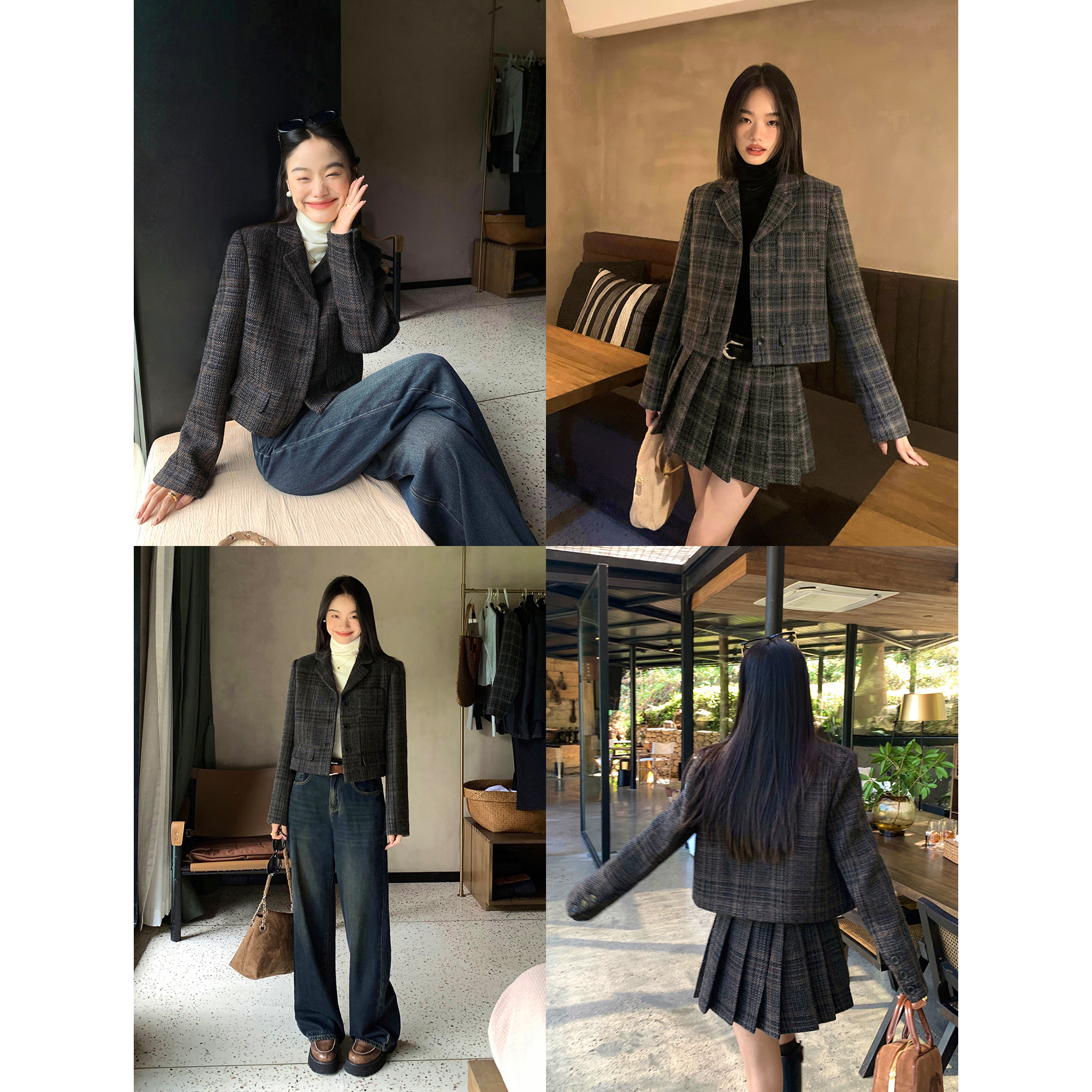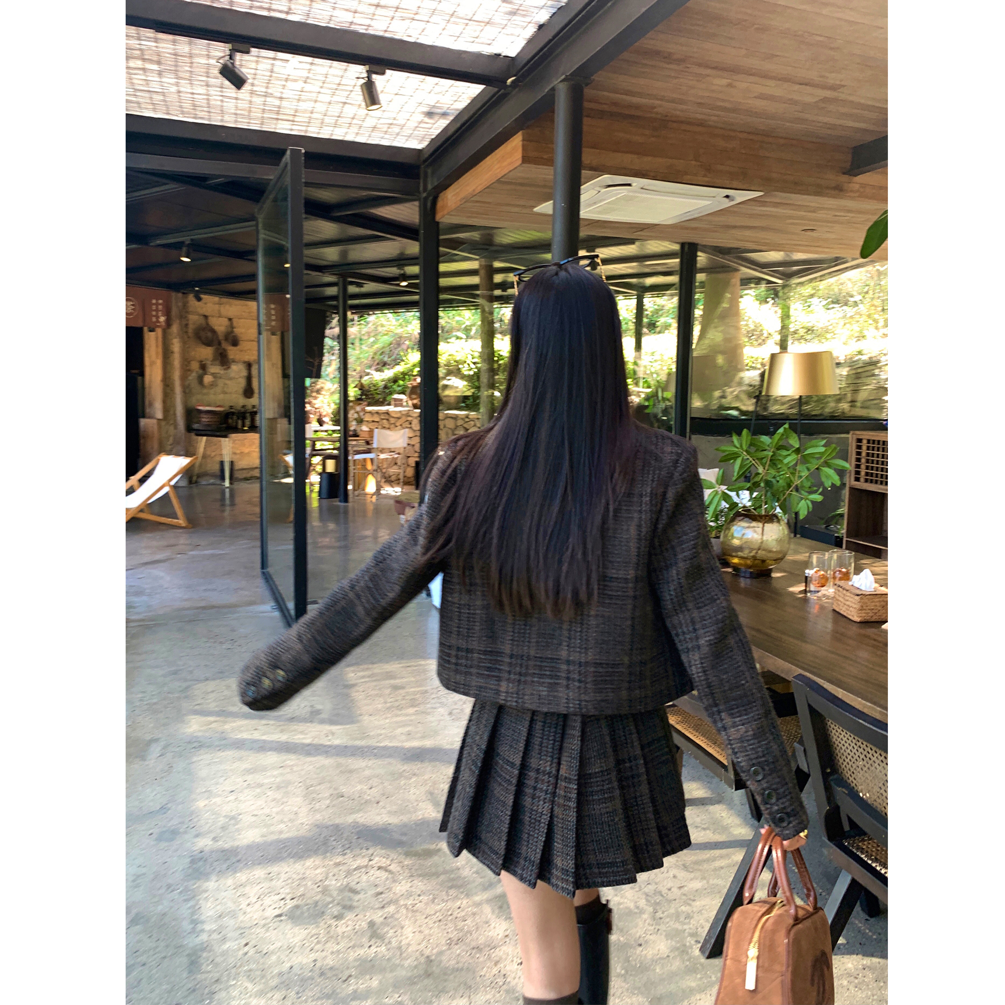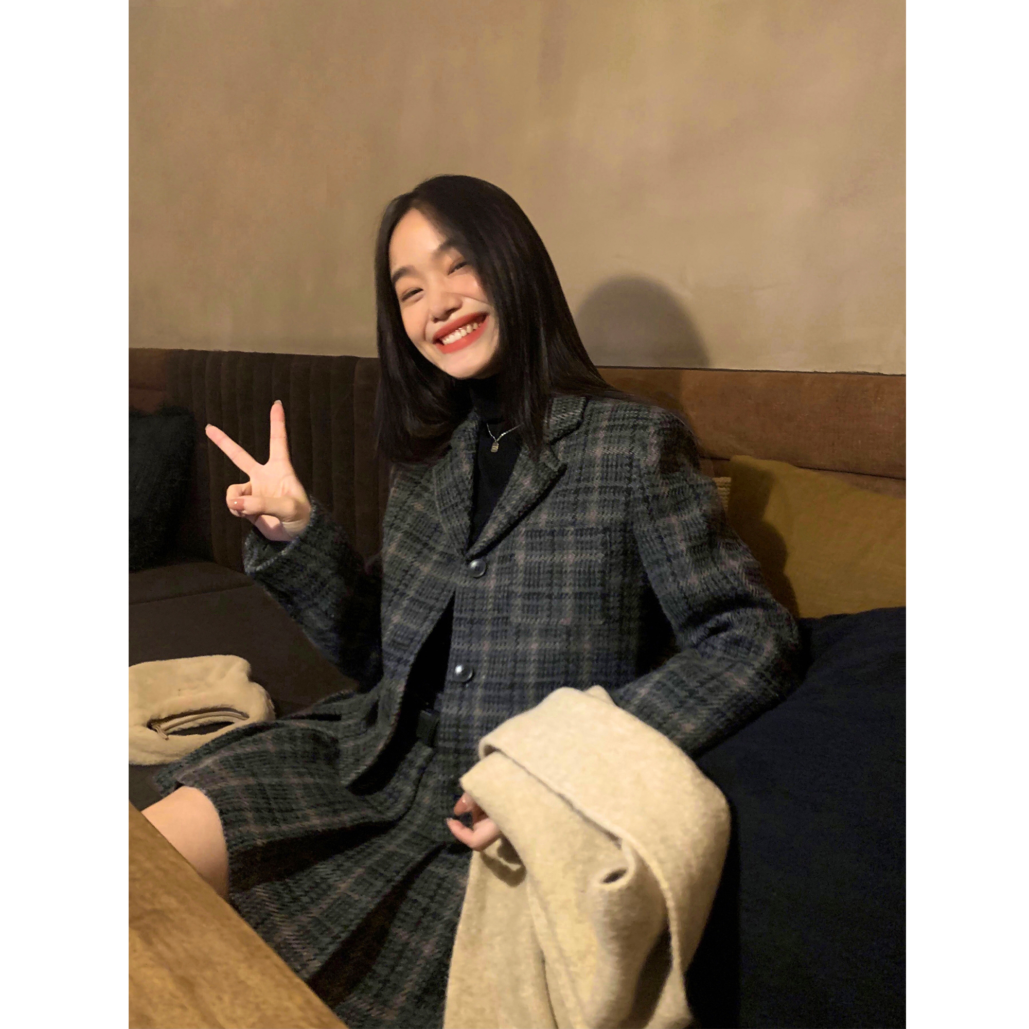 pusumede 咖色格子毛呢外套女冬季新款韩系复古休闲短款羊毛上衣
