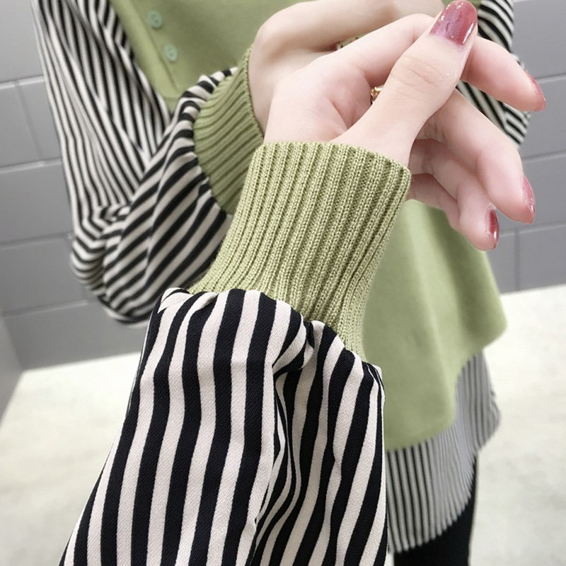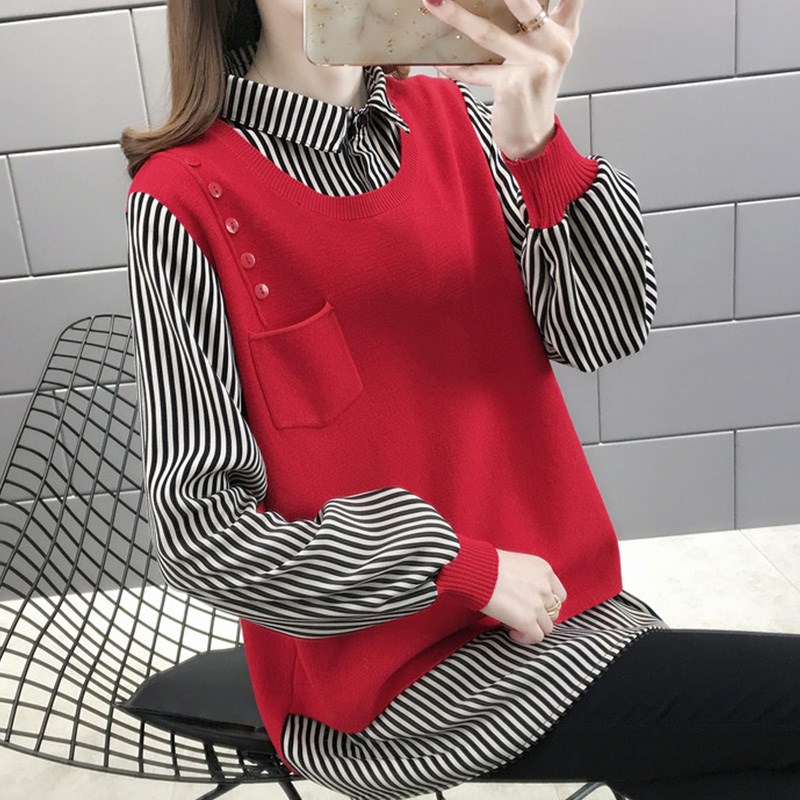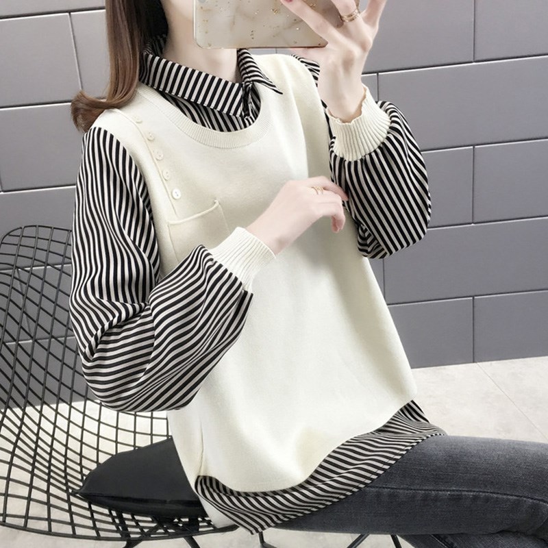 毛衣女春秋2024年新款套头宽松外穿衬衫领假两件时尚针织衫上衣潮