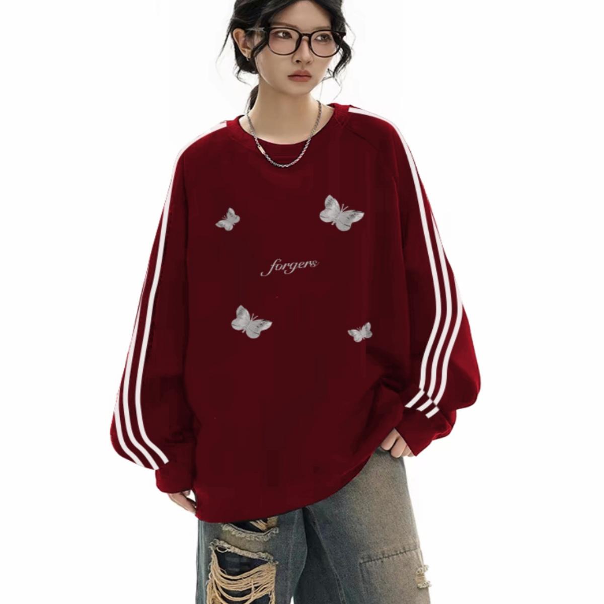 2024新款秋冬加绒加厚连帽卫衣女三条杠宽松休闲百搭套头外套上衣