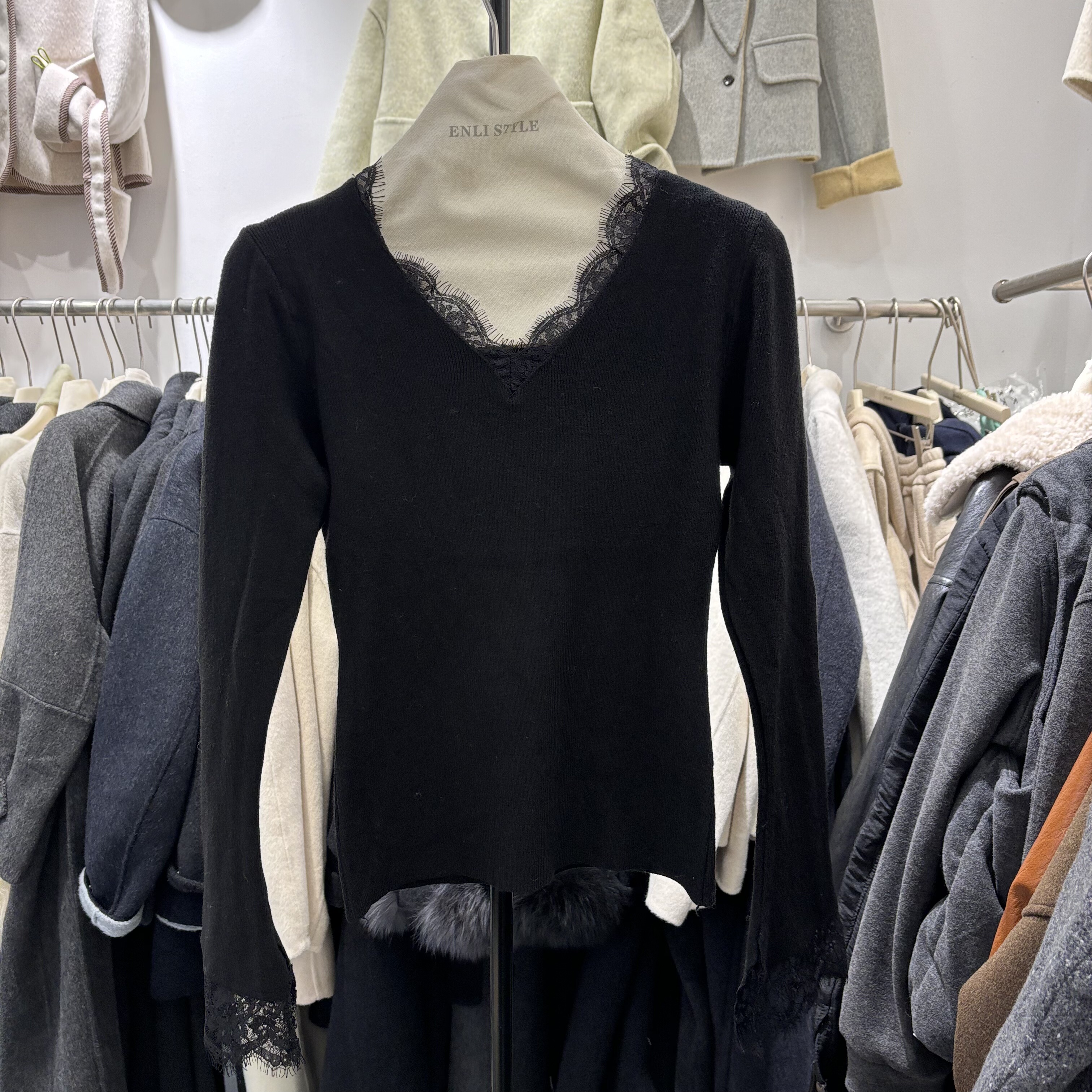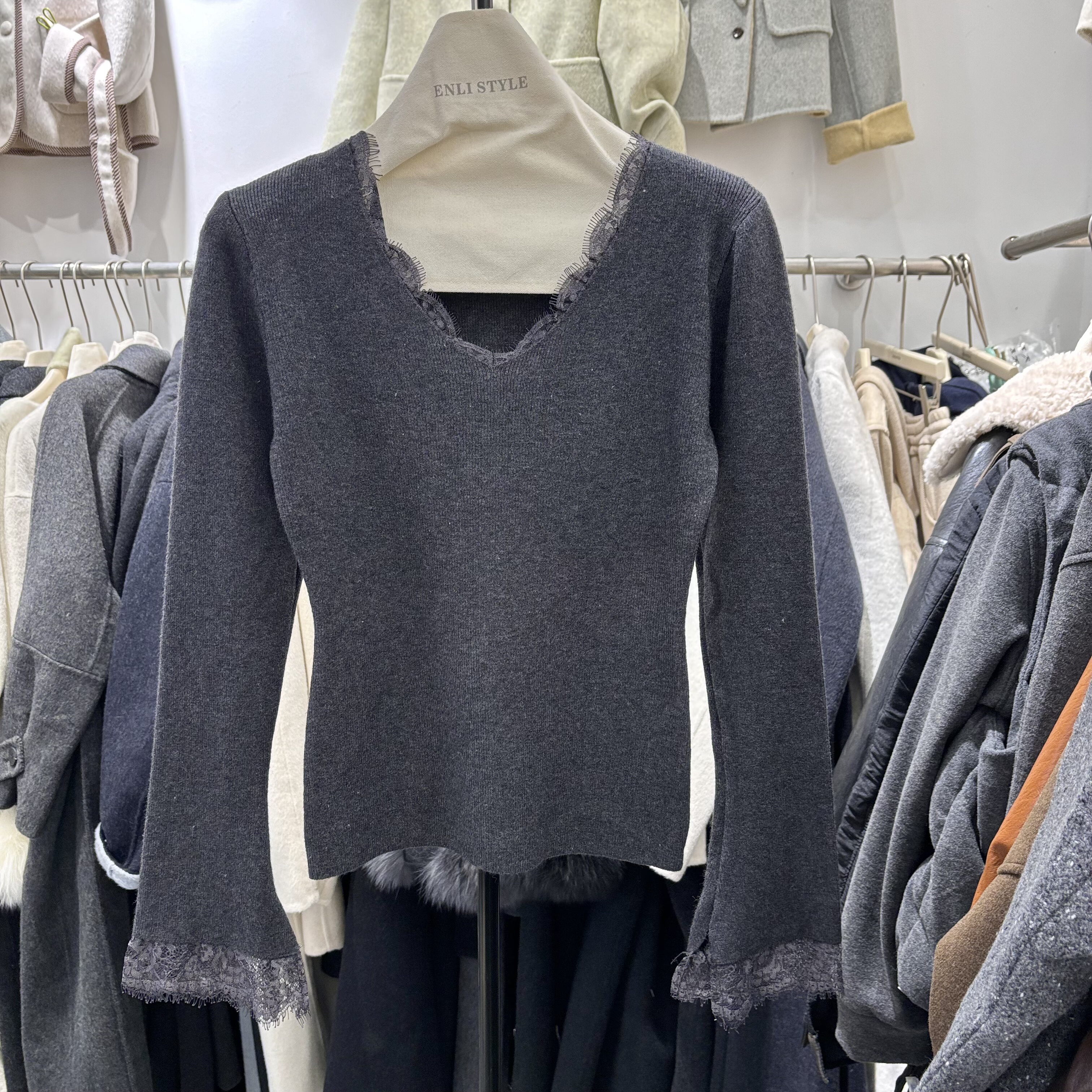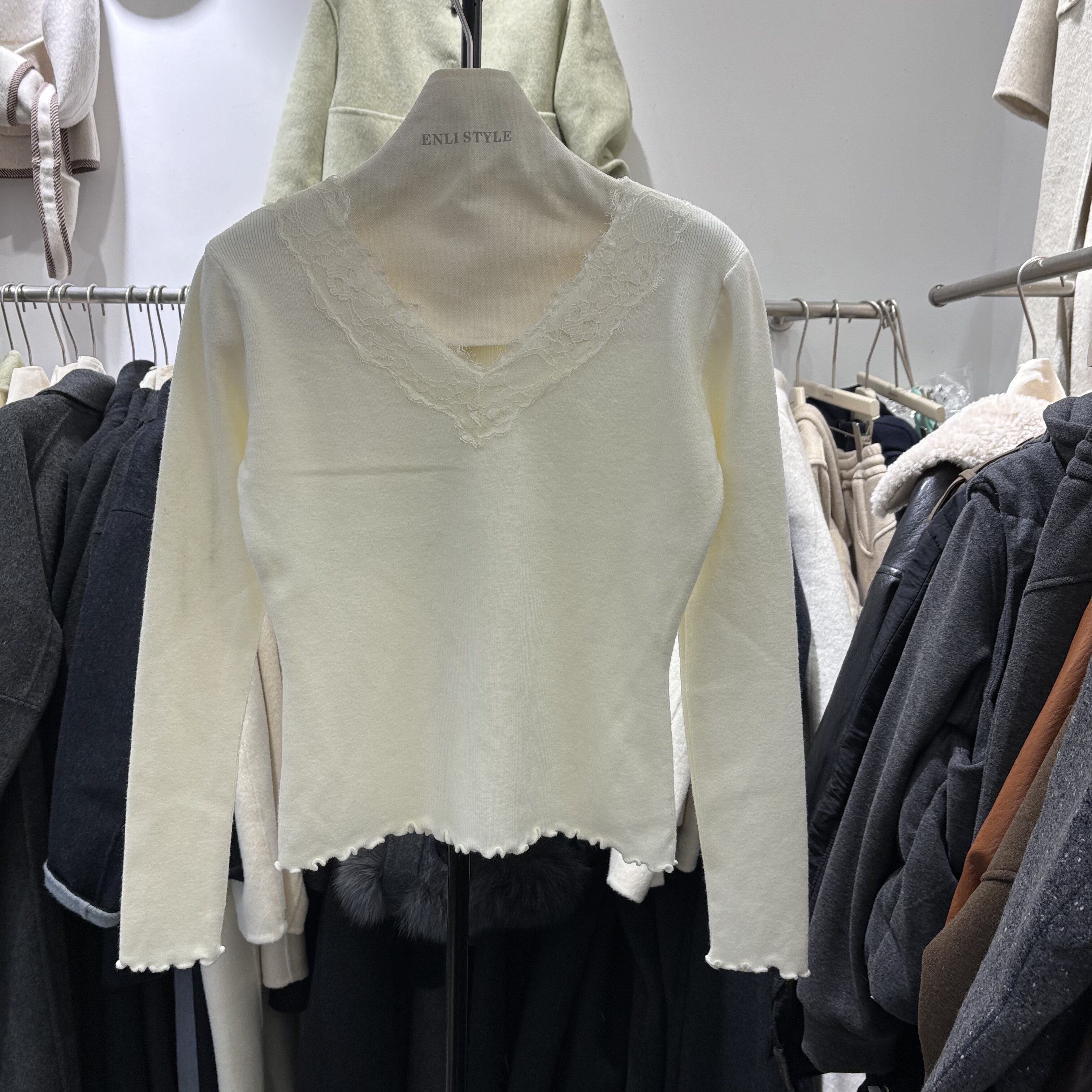 法式复古蕾丝拼接v领长袖t恤女秋季新款修身显瘦内搭打底衫上衣服