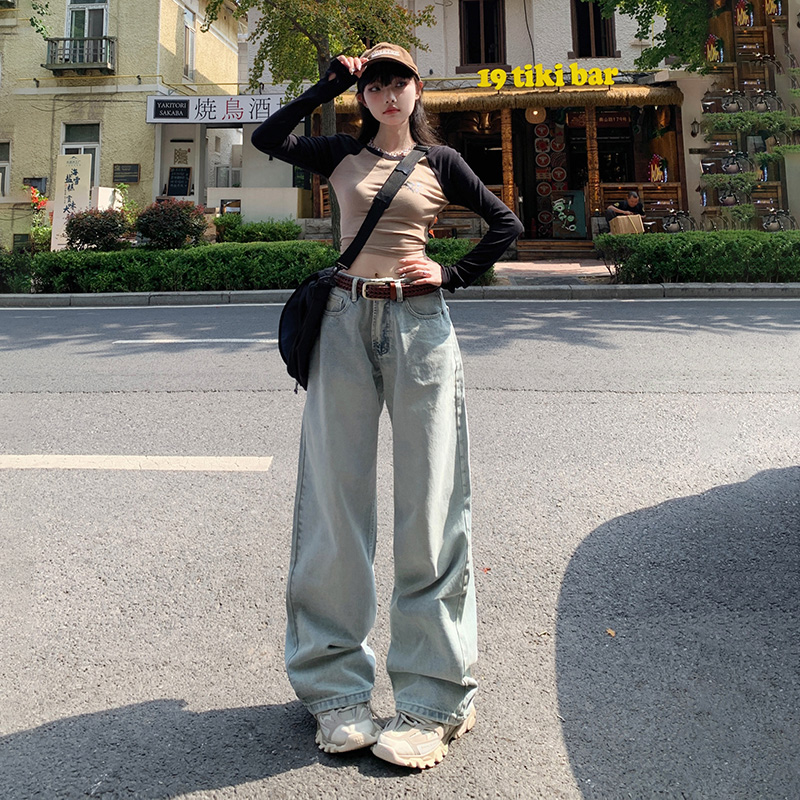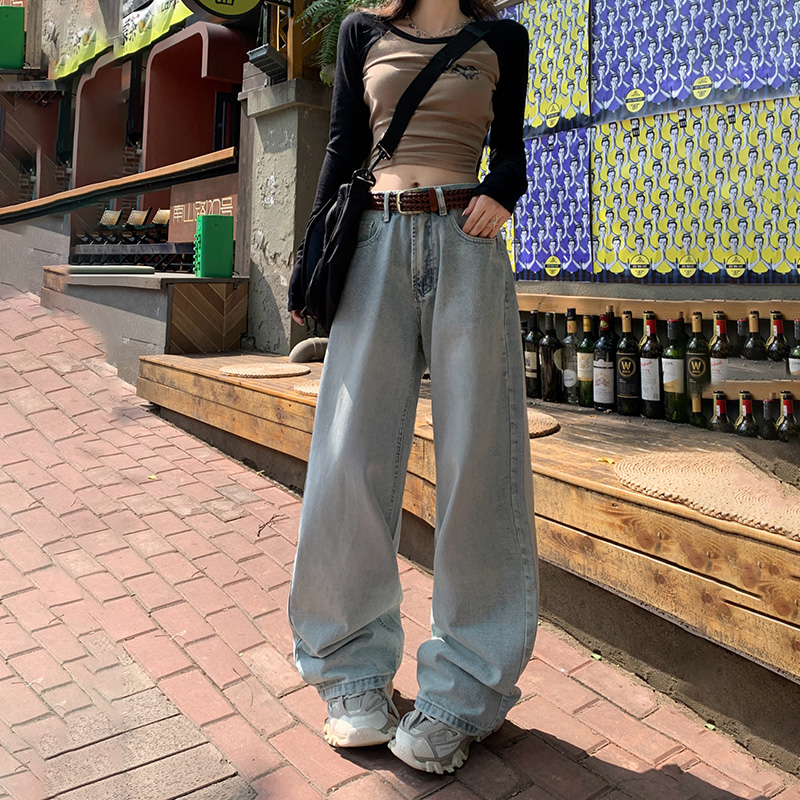 美式复古阔腿牛仔裤女2025春季新款高腰显瘦显高直筒宽松拖地裤子