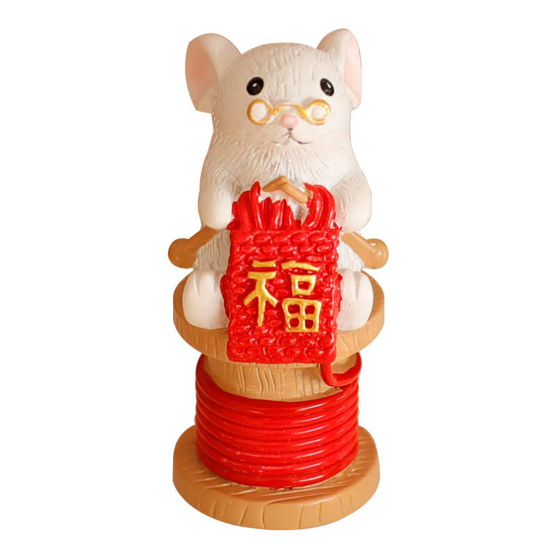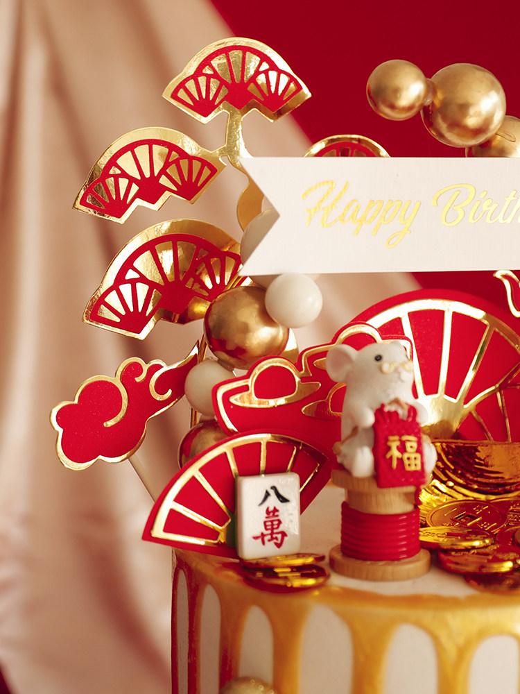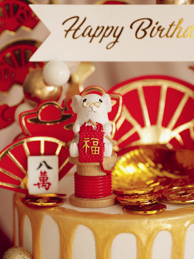 烘焙蛋糕装饰织福小老鼠玩偶摆件新年红金扇子元宝福字插牌插件