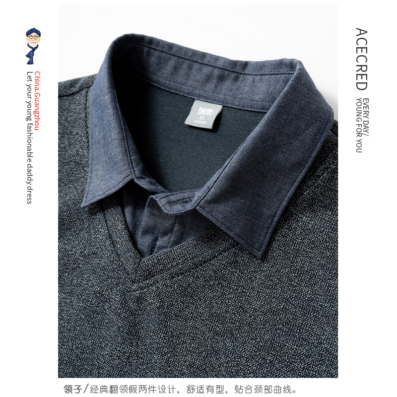 中年爸爸秋装上衣长袖T恤中老年人男装爷爷老人假两件春秋季衣服