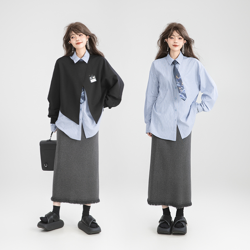 KEIKO 色织蓝色条纹长袖衬衫女25早秋新款轻法风穿搭宽松休闲衬衣