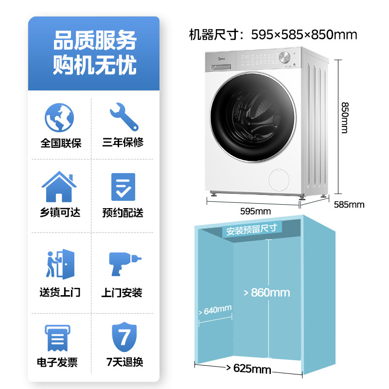 美的10kg滚筒洗衣机纯平嵌家用全自动洗脱洗烘一体大容量智投L1