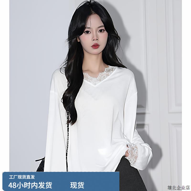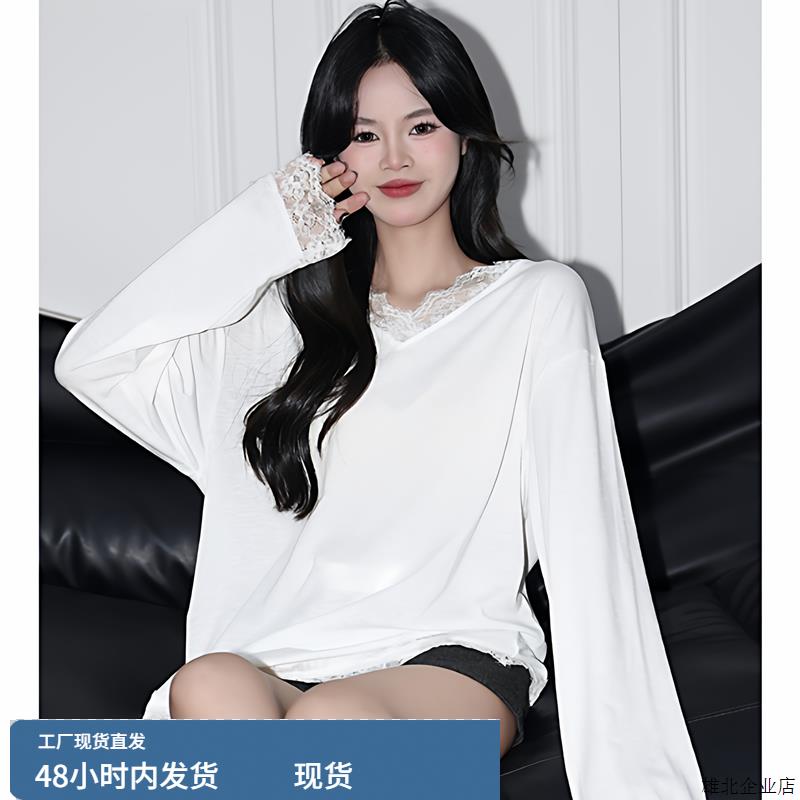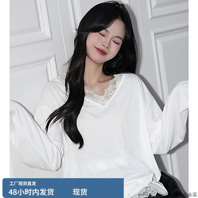 韩系氛围感蕾丝拼接白色长袖T恤女2025新款秋冬宽松内搭绝美上衣