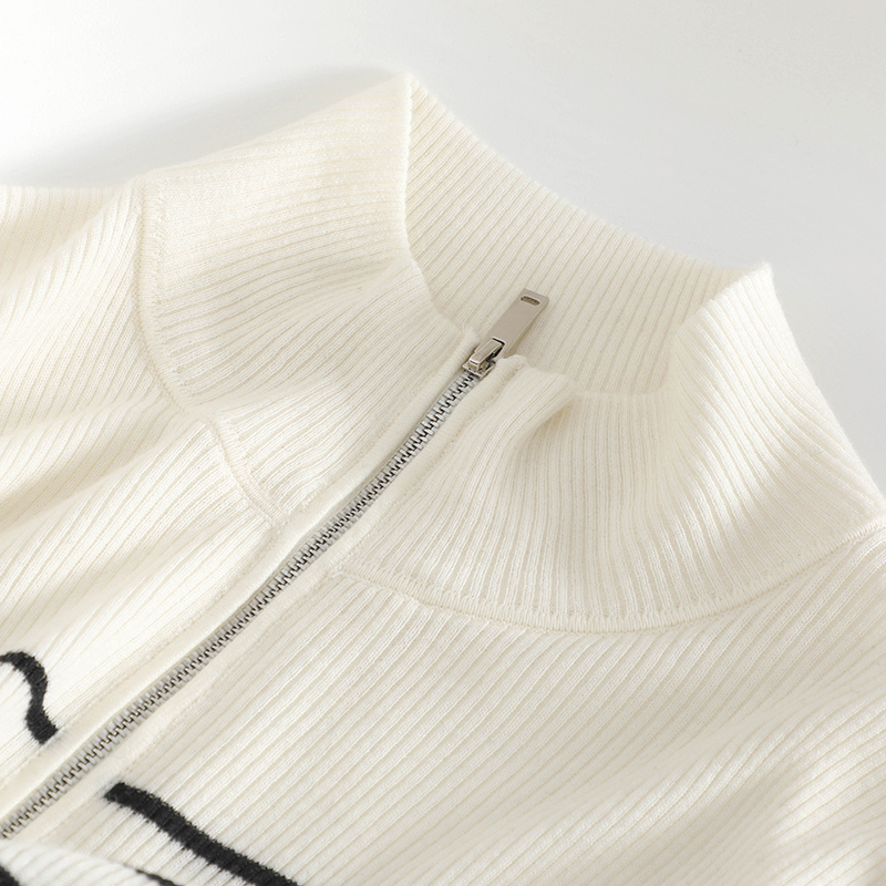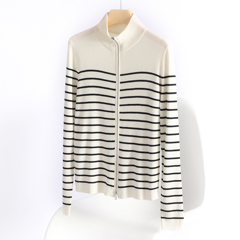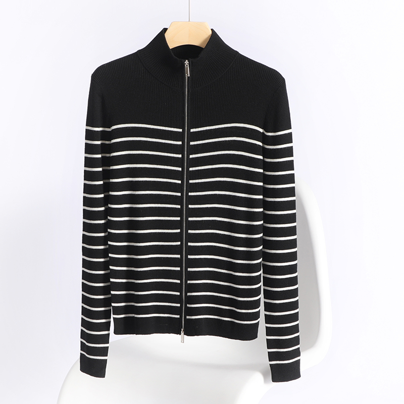 【精致艺术】精纺超细羊毛立领黑白条纹针织开衫女拉链薄款外套