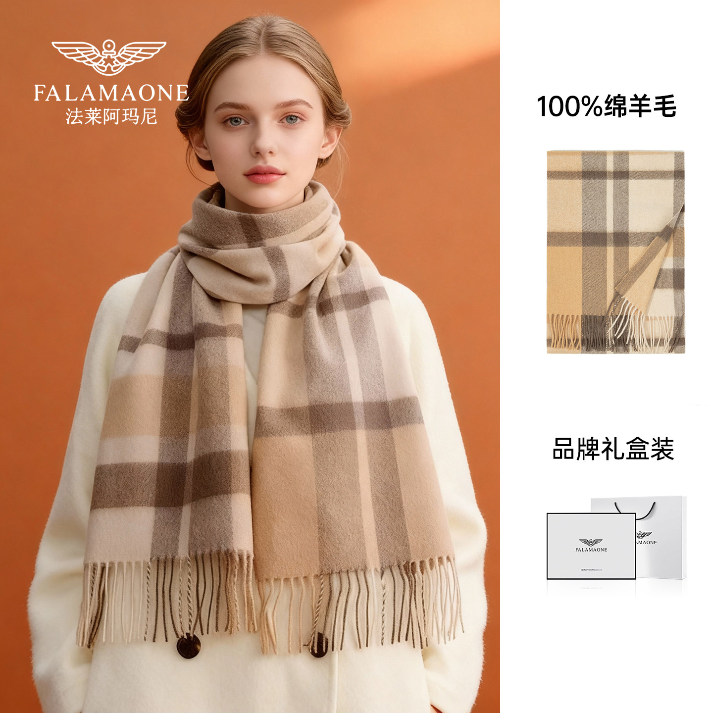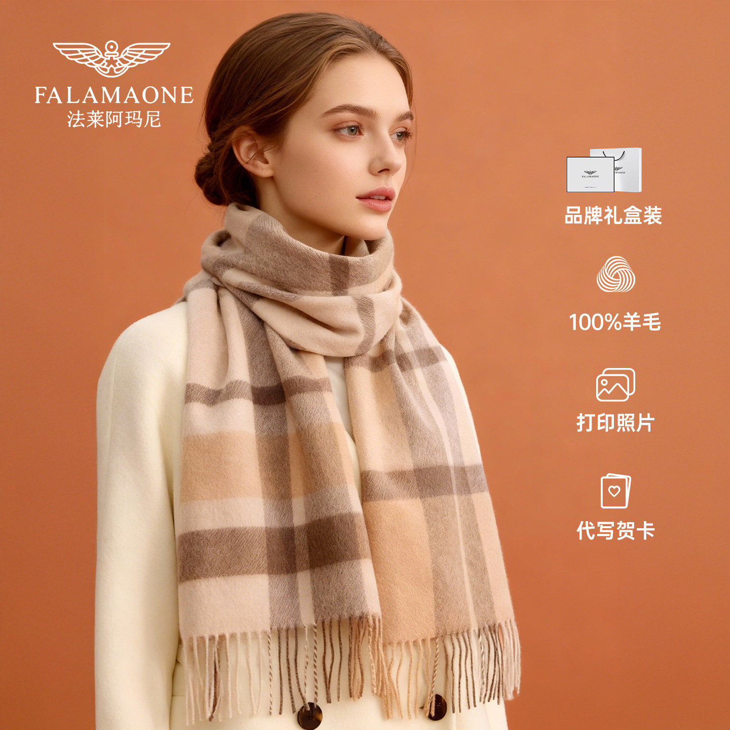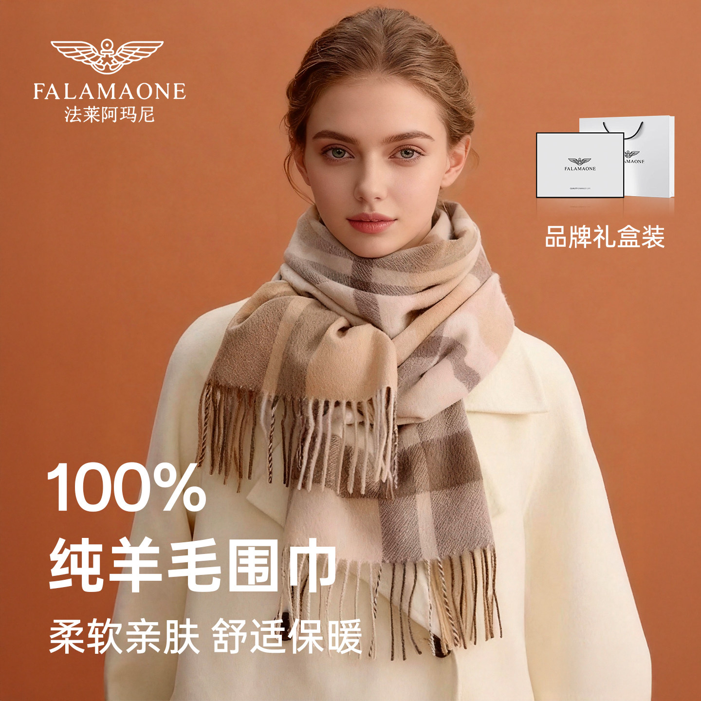 法莱阿玛尼100%纯羊毛围巾女款2025新款冬格子围脖女生日礼物高档