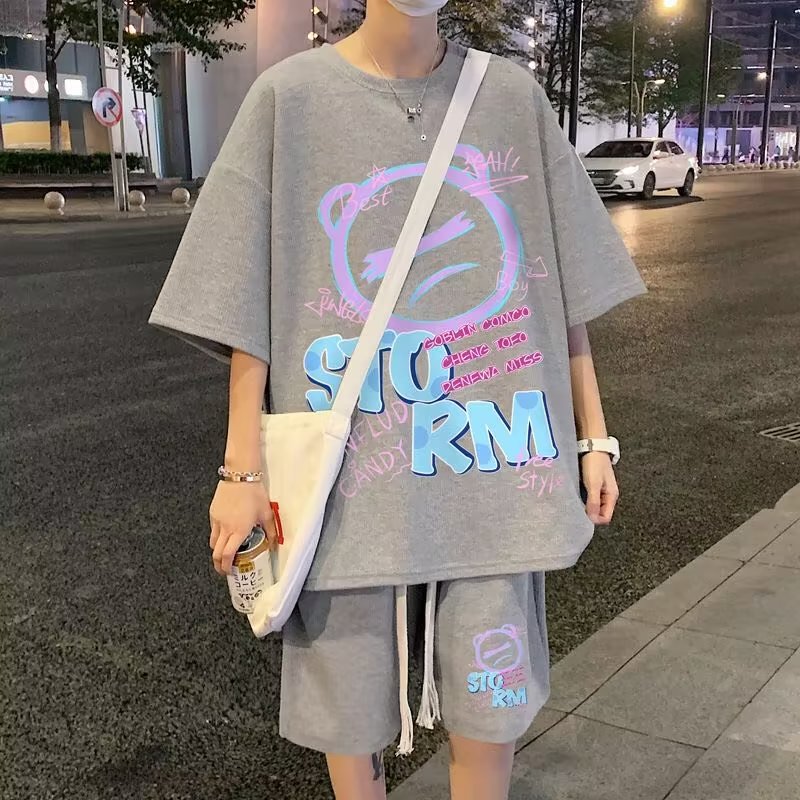 华夫格休闲套装男夏季潮流卡通印花宽松运动短袖短裤搭配两件套潮