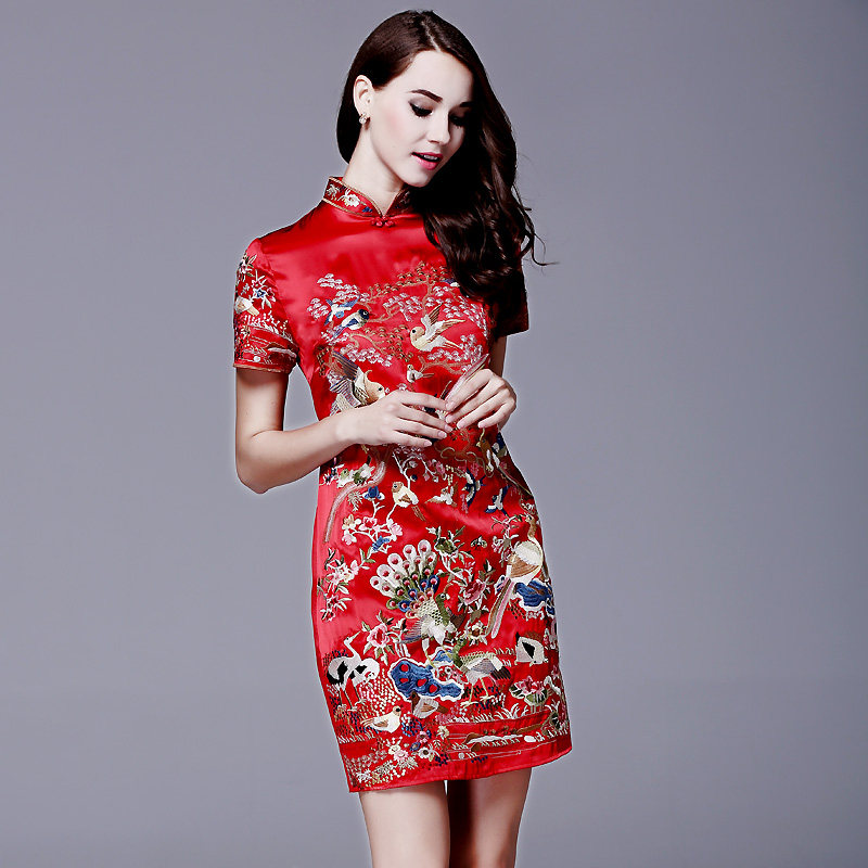 新中式连衣裙夏薄百鸟朝凤中国风真丝刺绣花改良旗袍裙特价清仓