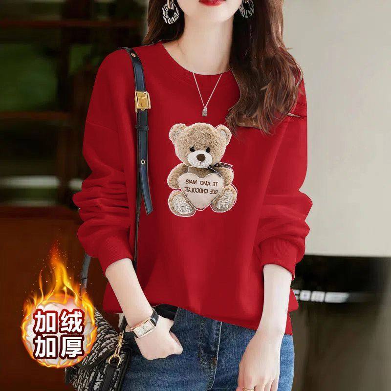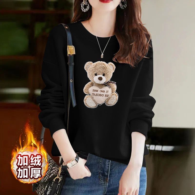 纯棉小个子卫衣女秋冬季韩版宽松洋气小熊印花百搭加绒加厚外套衫