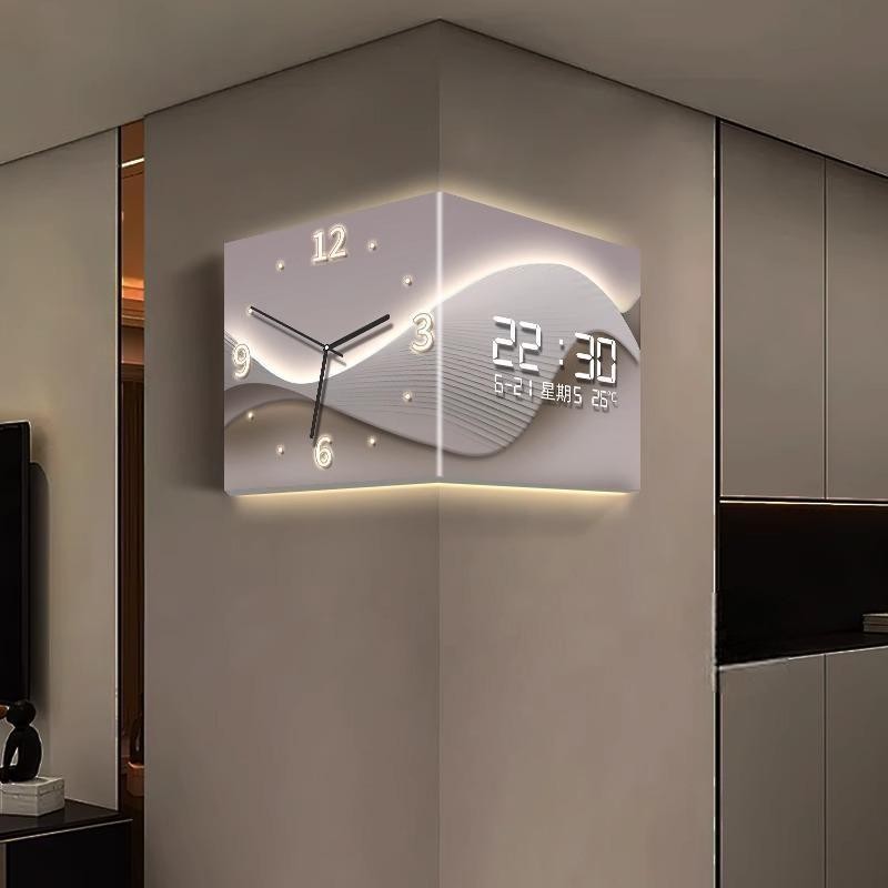 双面转角挂钟装饰画简约现代客厅拐角时钟画创意电子日历钟表挂画