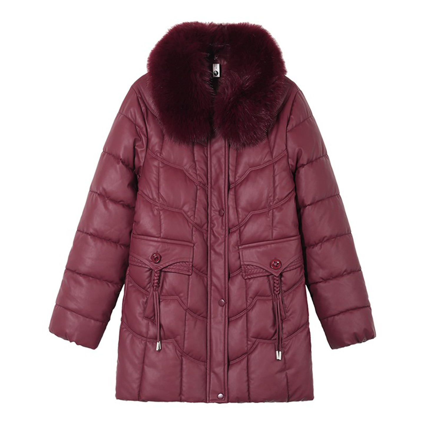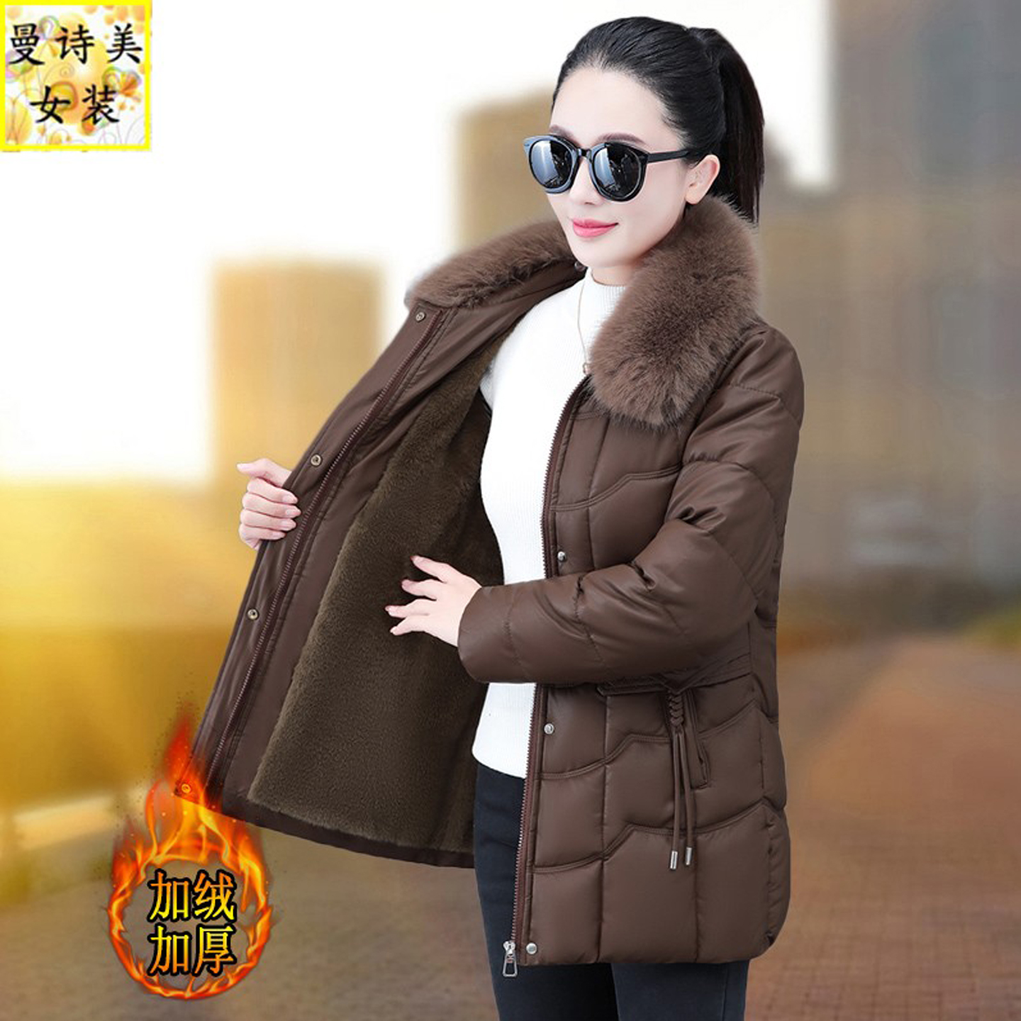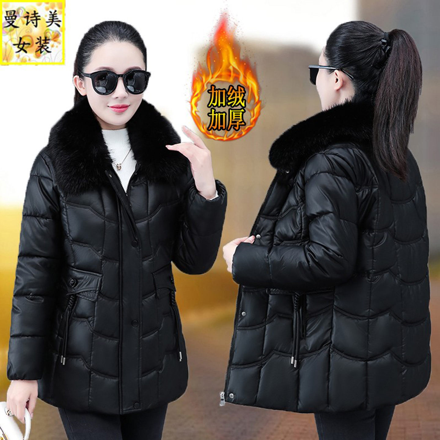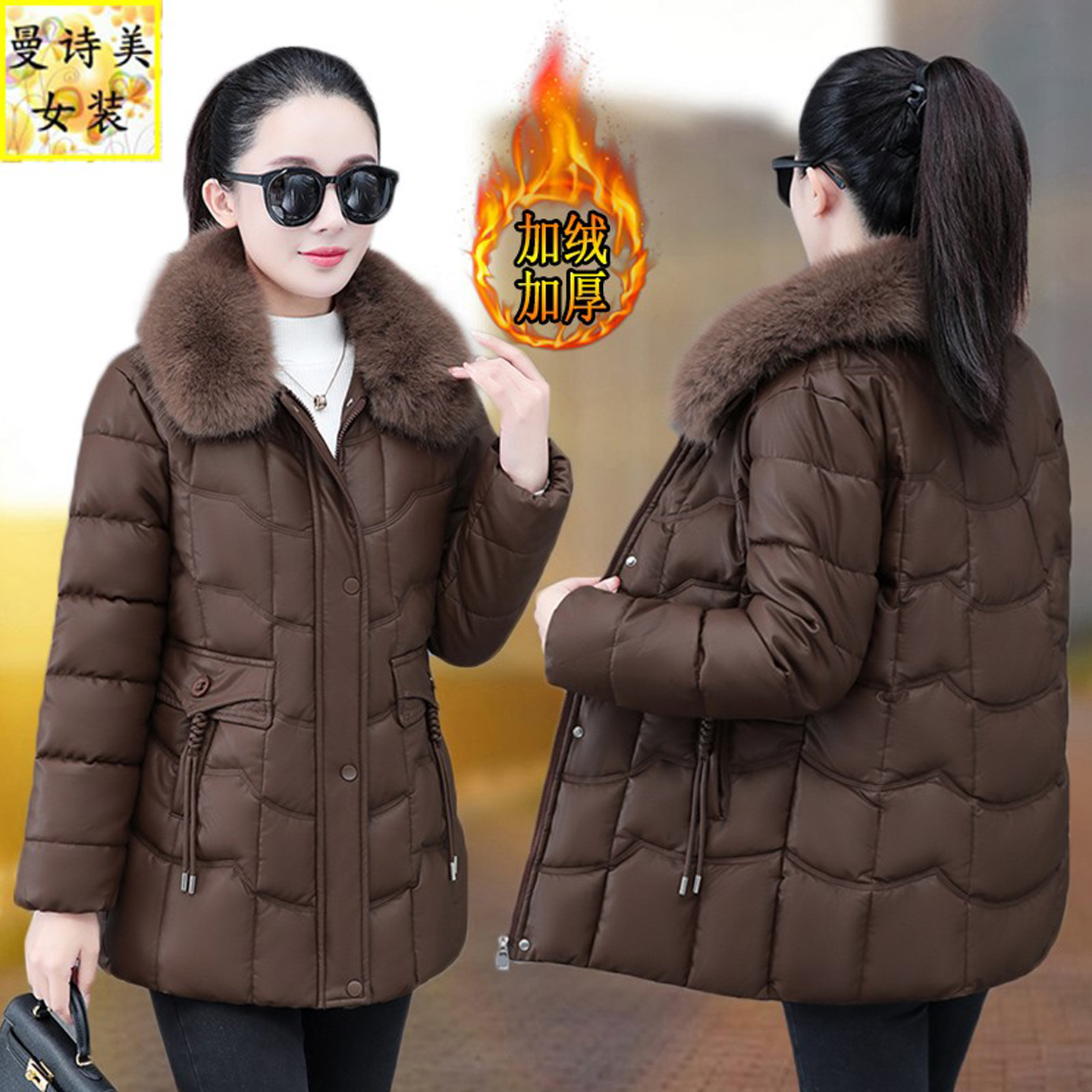 pu皮中长款棉服女2025新款冬季时髦中老年妈妈洋气加绒羽绒棉棉衣