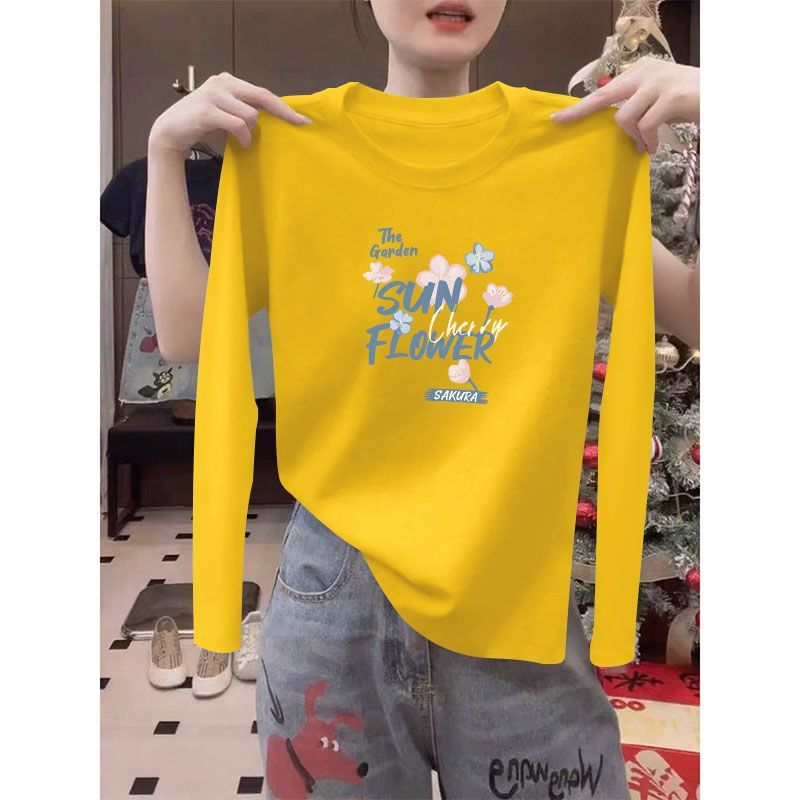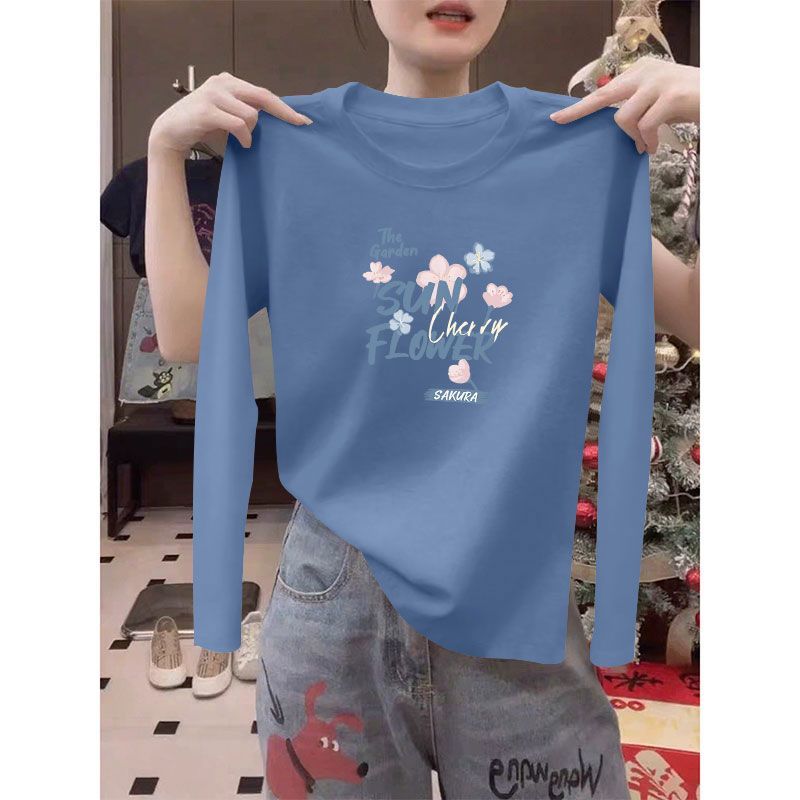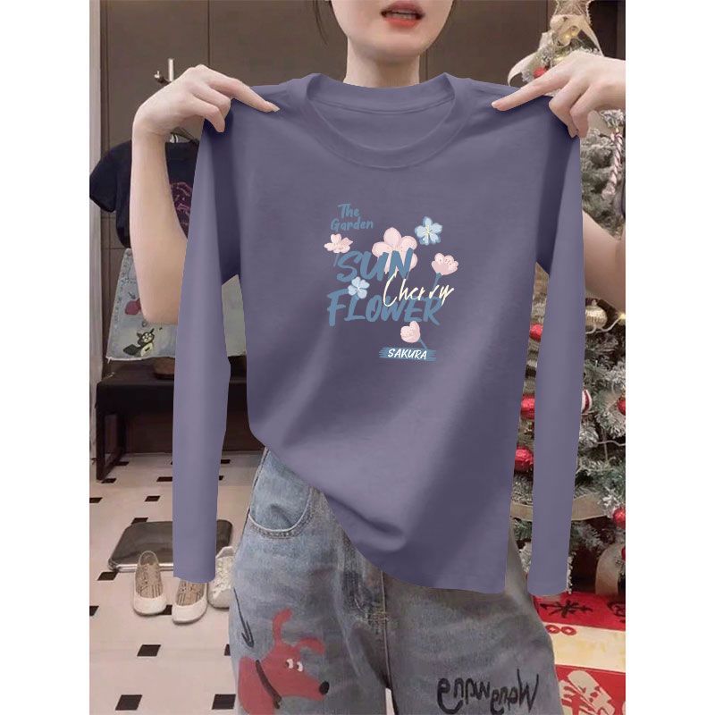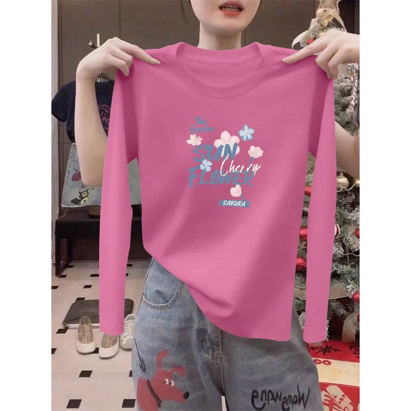 春秋女士纯棉圆领长袖T恤韩版洋气宽松遮肉显瘦印花套头休闲上衣