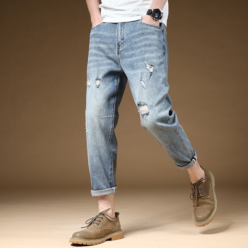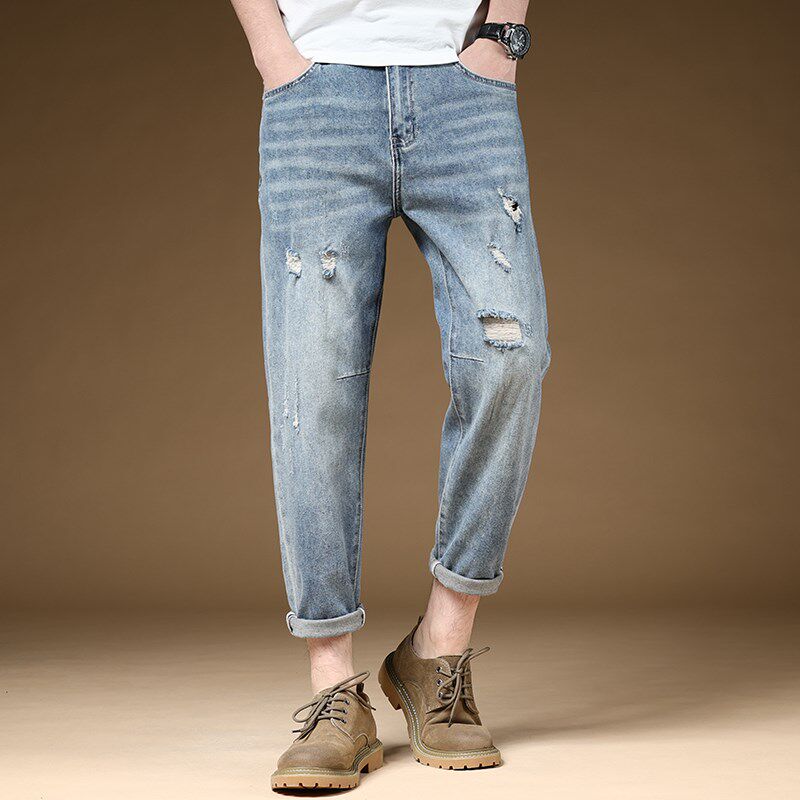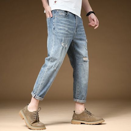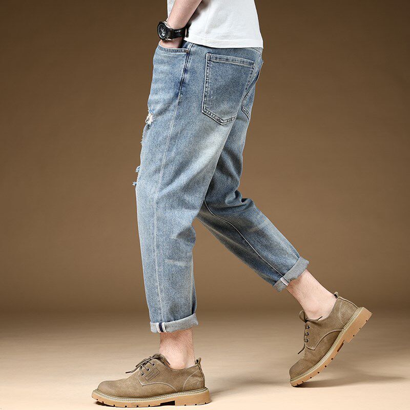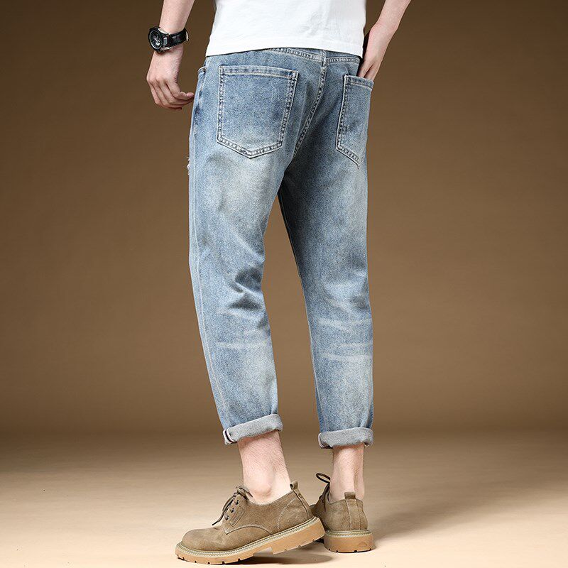 夏季薄款破洞牛仔裤男浅蓝色弹力休闲9分裤八分九分裤子潮流百搭