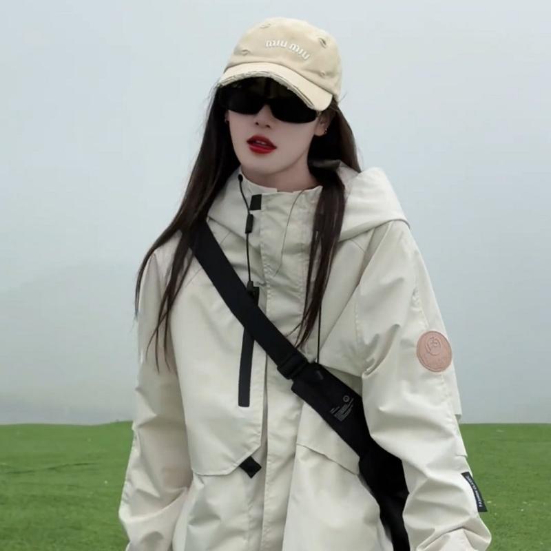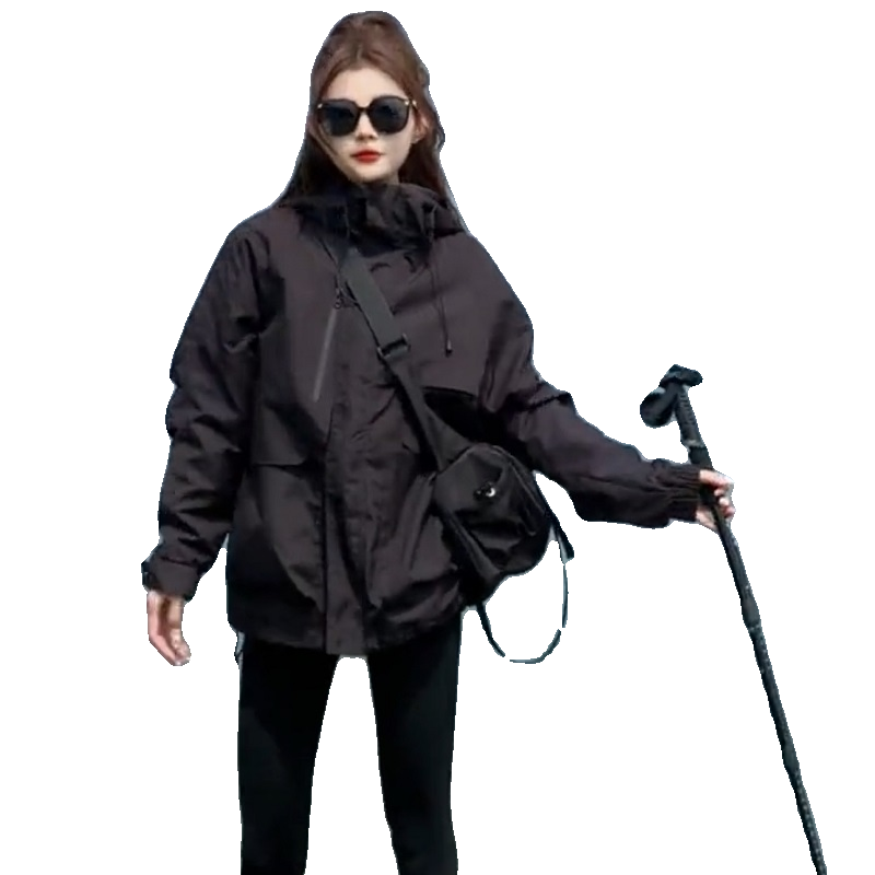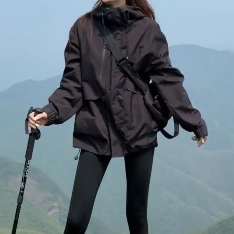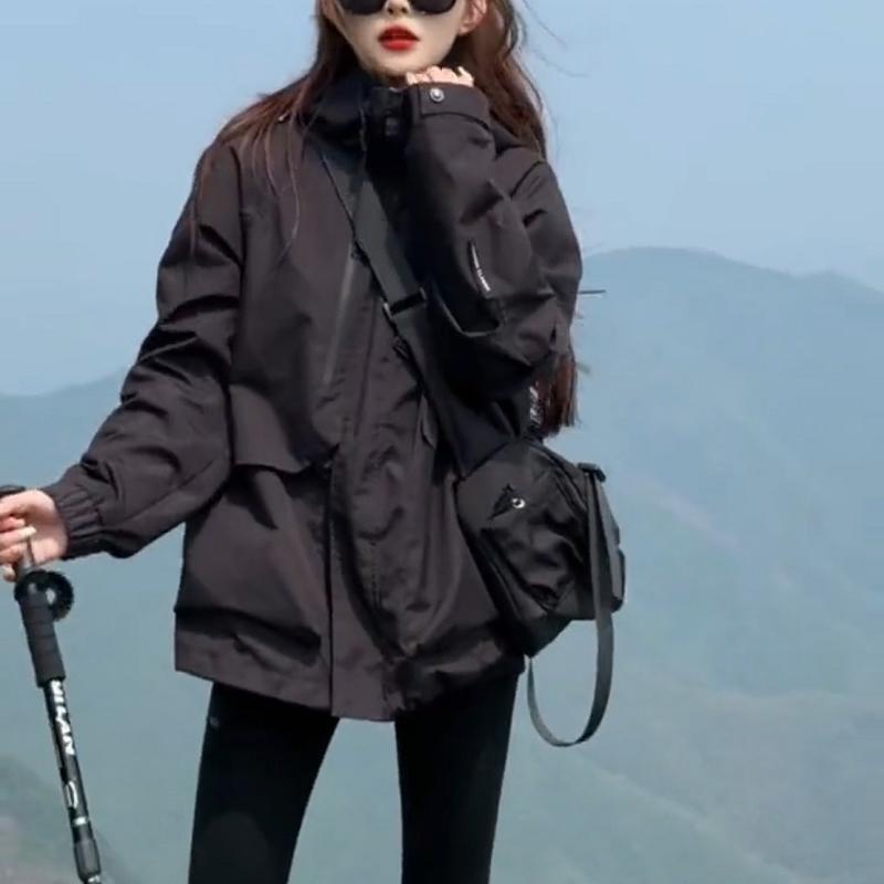 黑色冲锋衣女款外套2025春秋新款宽松连帽工装薄款外套小个子上衣