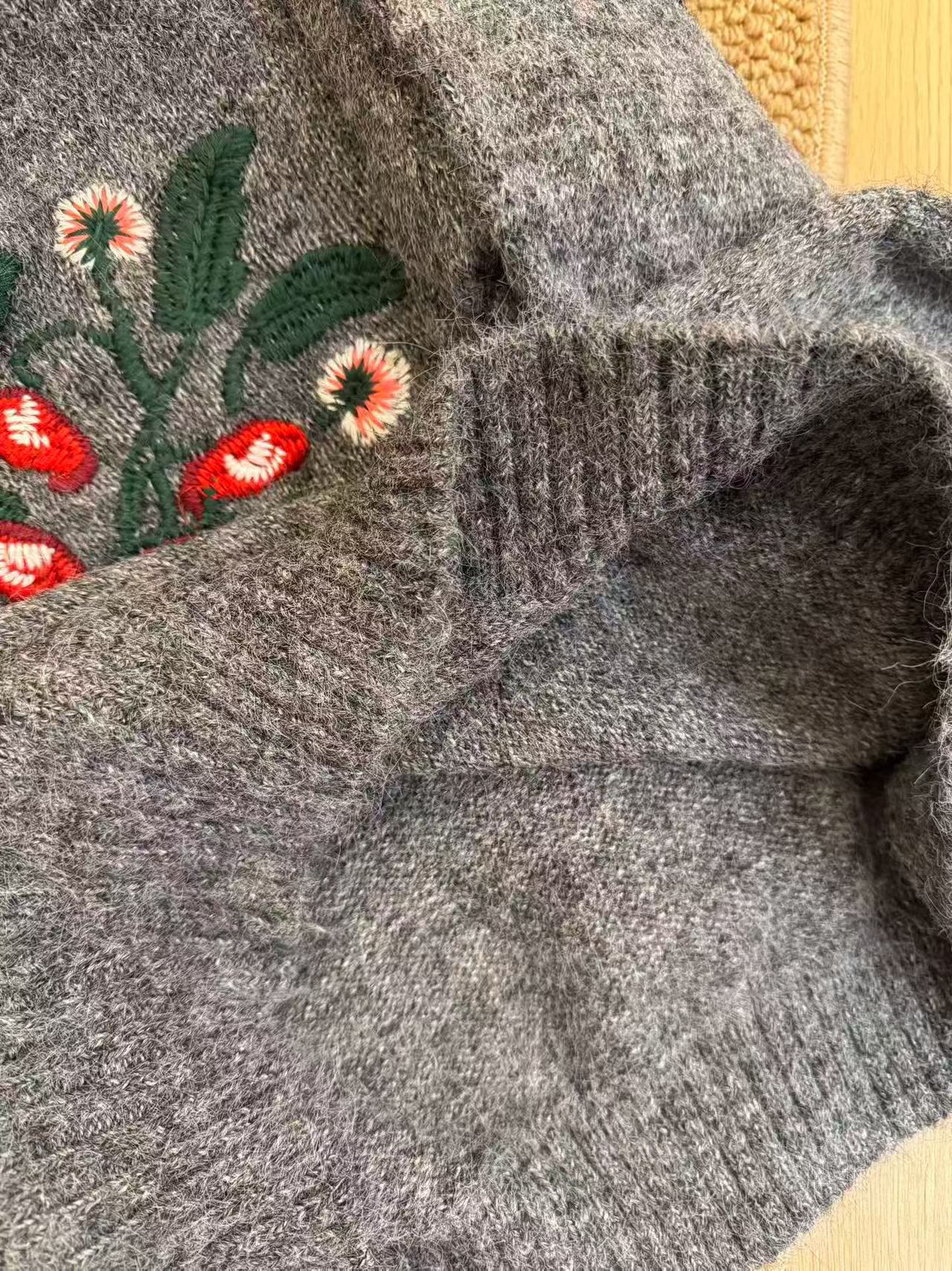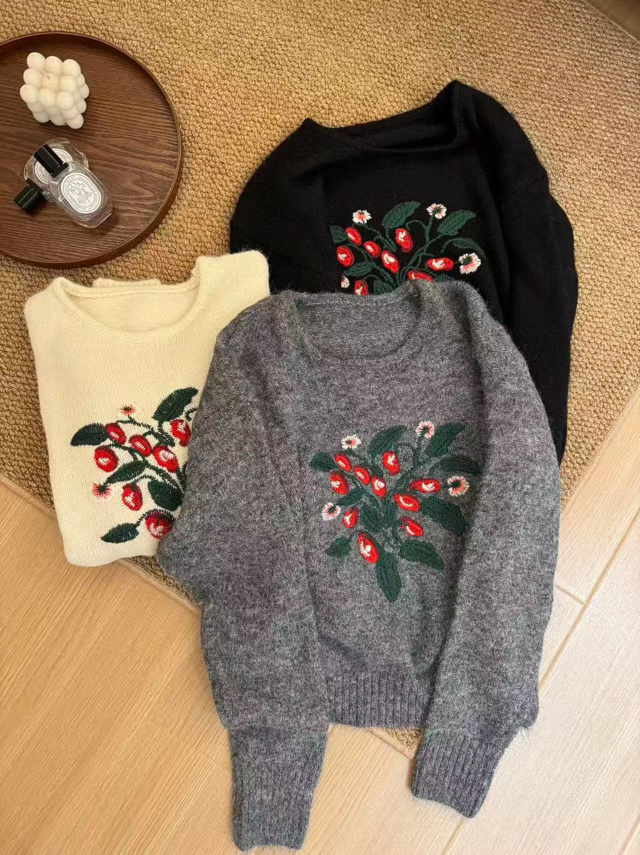 重工刺绣花朵毛衣套头针织衫宽松毛衫圆领打底衫