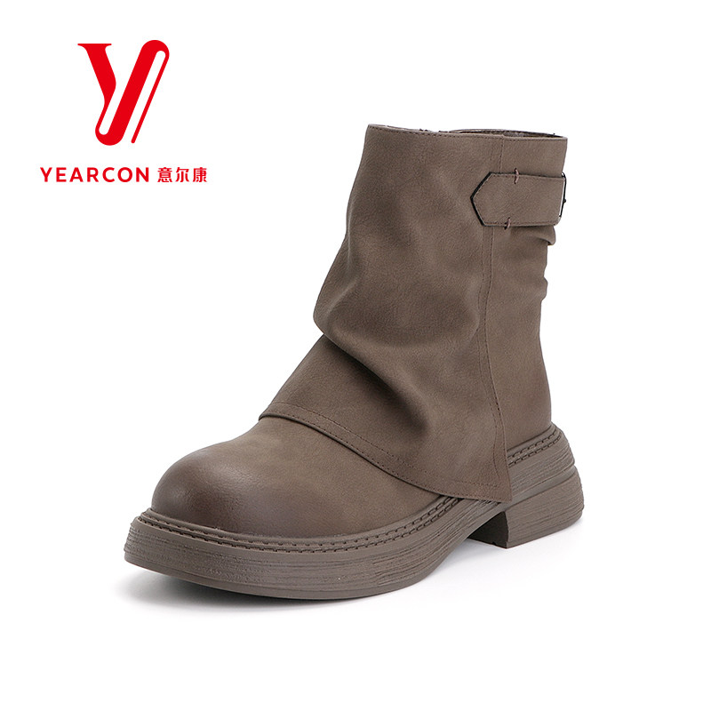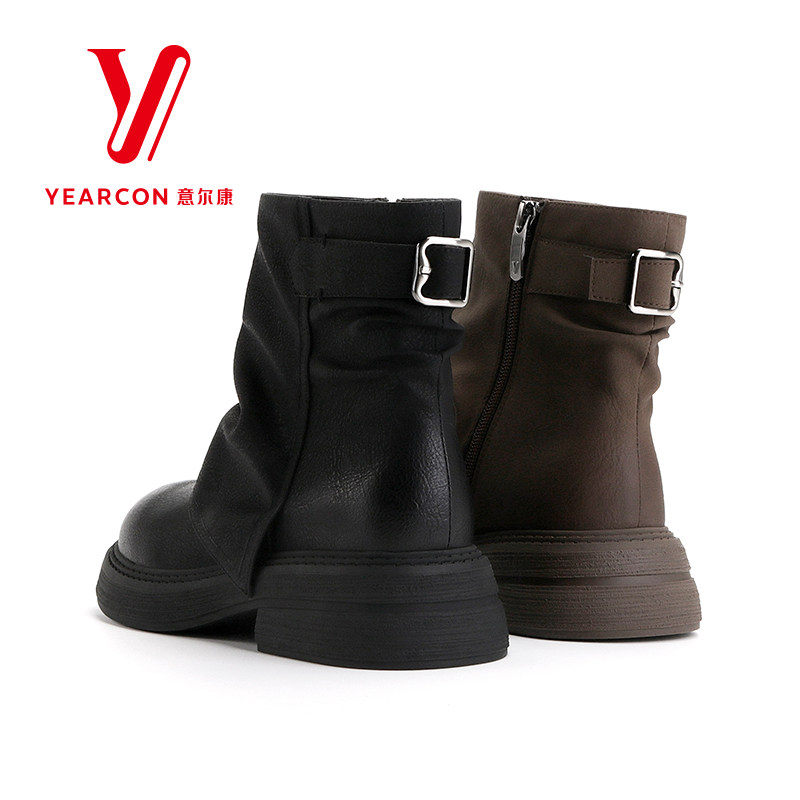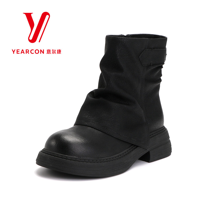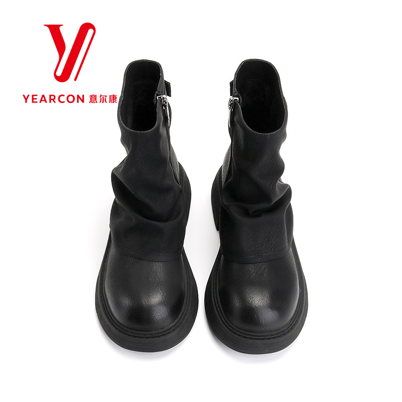 意尔康女靴2025新款冬季真皮短靴女加绒靴子时装裤管靴粗跟堆堆靴