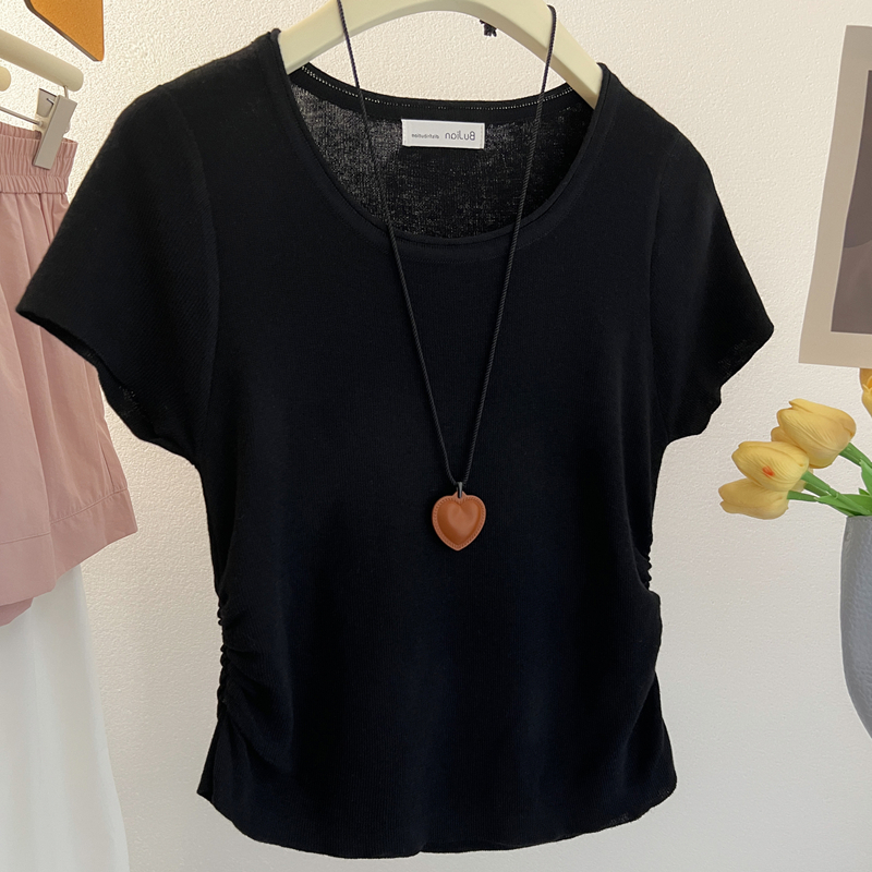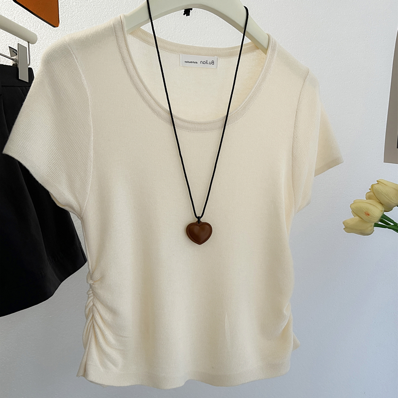 燕麦色miu系圆领褶皱收腰冰丝针织短袖T恤女夏季绝美小众修身上衣