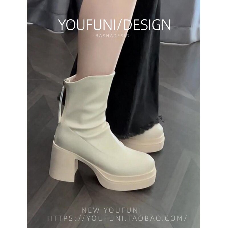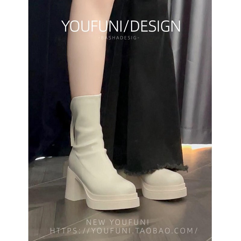 米白色瘦瘦马丁靴炸街短靴粗跟高跟厚底防水台秋冬新款切尔西靴女