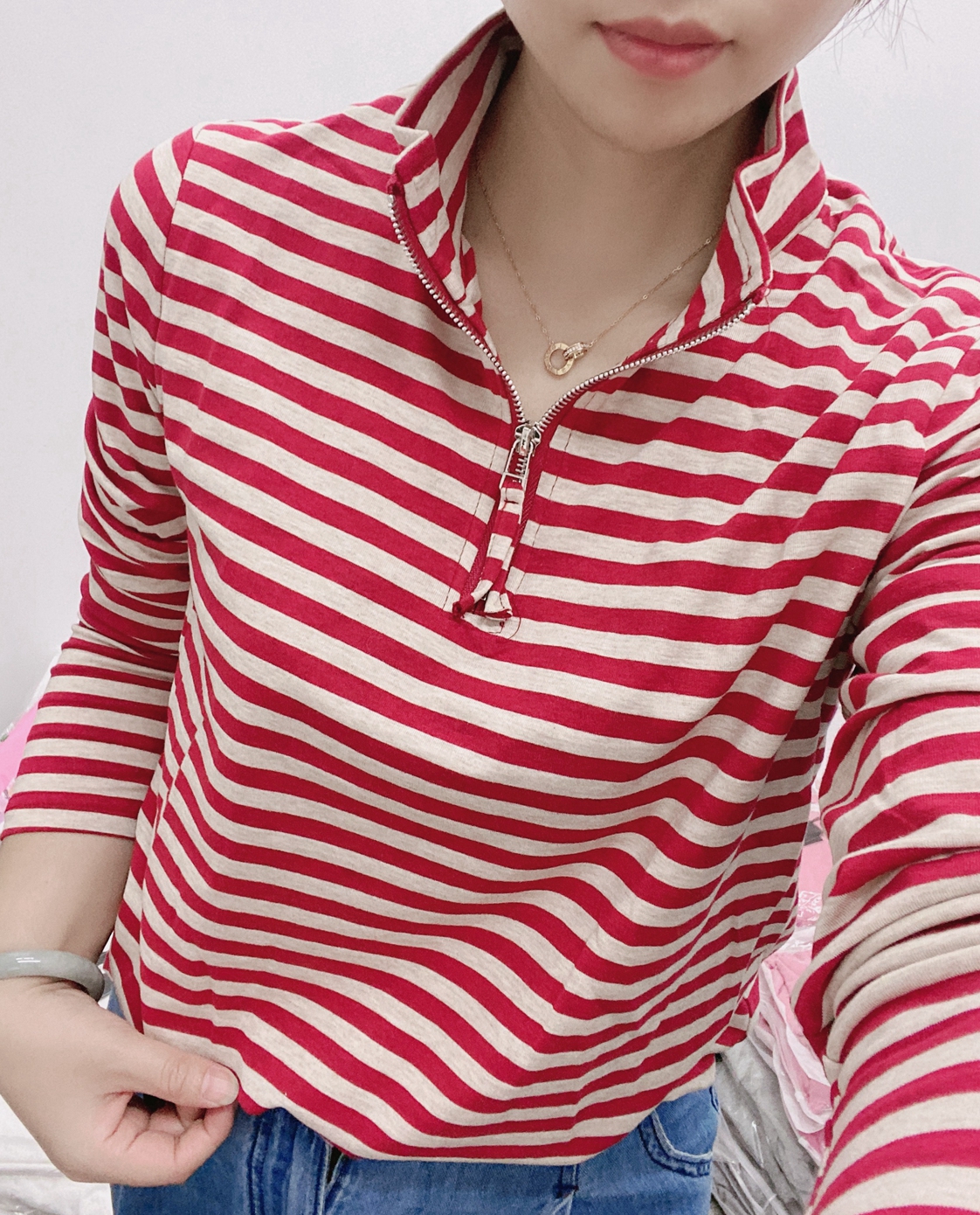 2025秋新款设计感小众立领长袖t恤女宽松显瘦百搭条纹拉链上衣潮T
