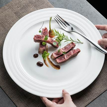 陶瓷白色简约线纹圆形盘子商用牛排餐盘西餐盘家用菜盘备菜盘碟子