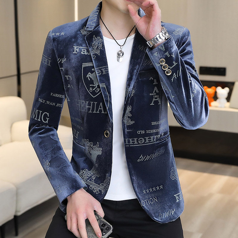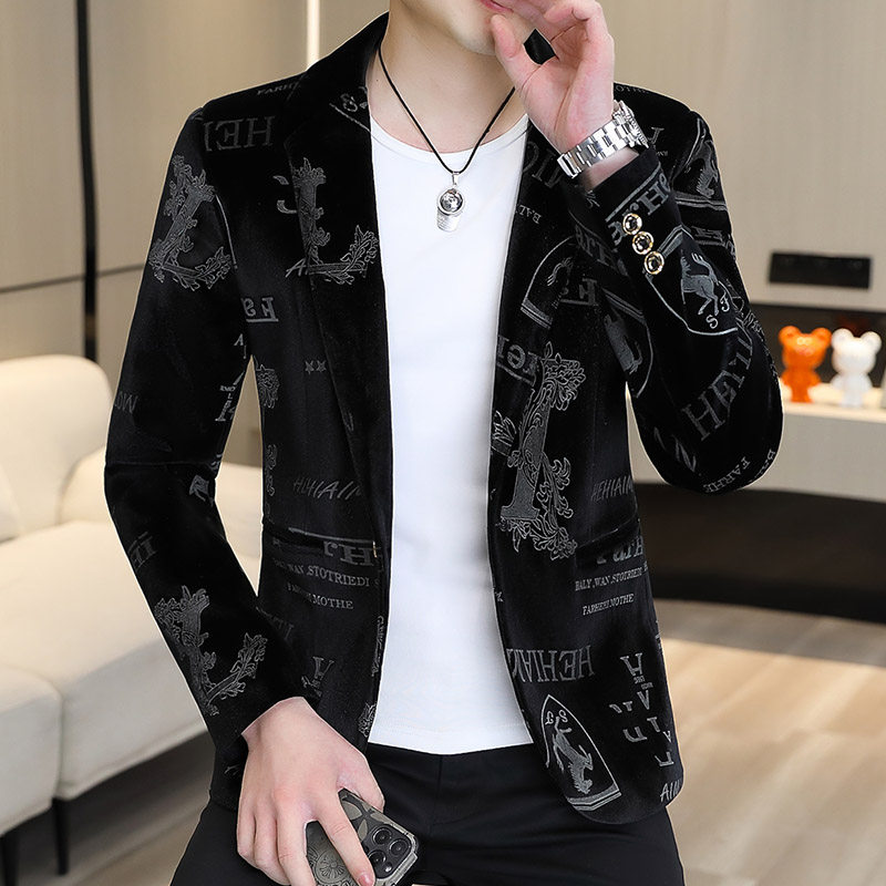秋冬季加绒西服男士金丝绒休闲个性印花单西外套痞帅气加厚小西装