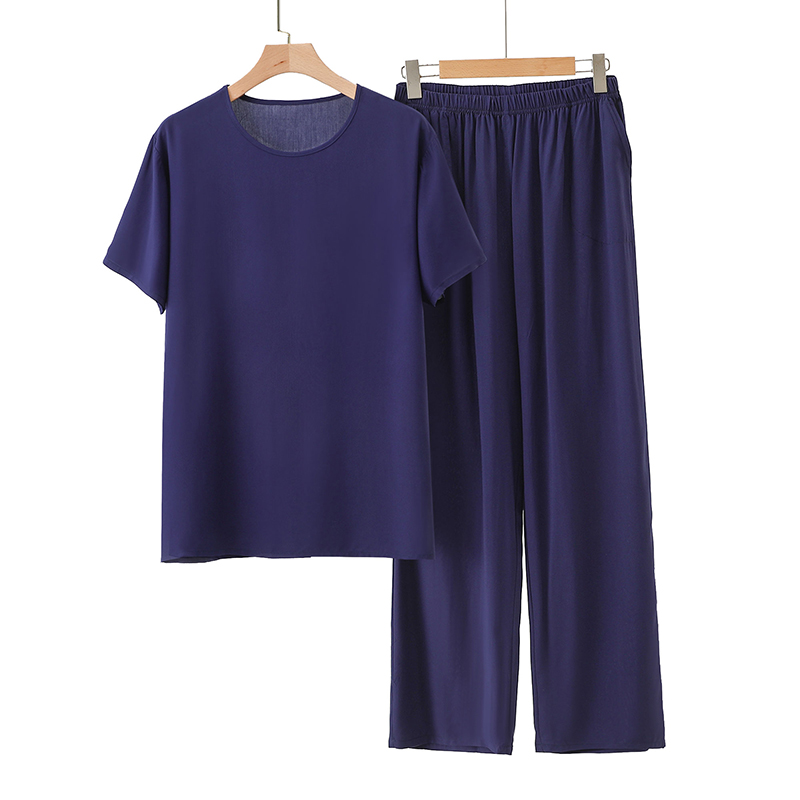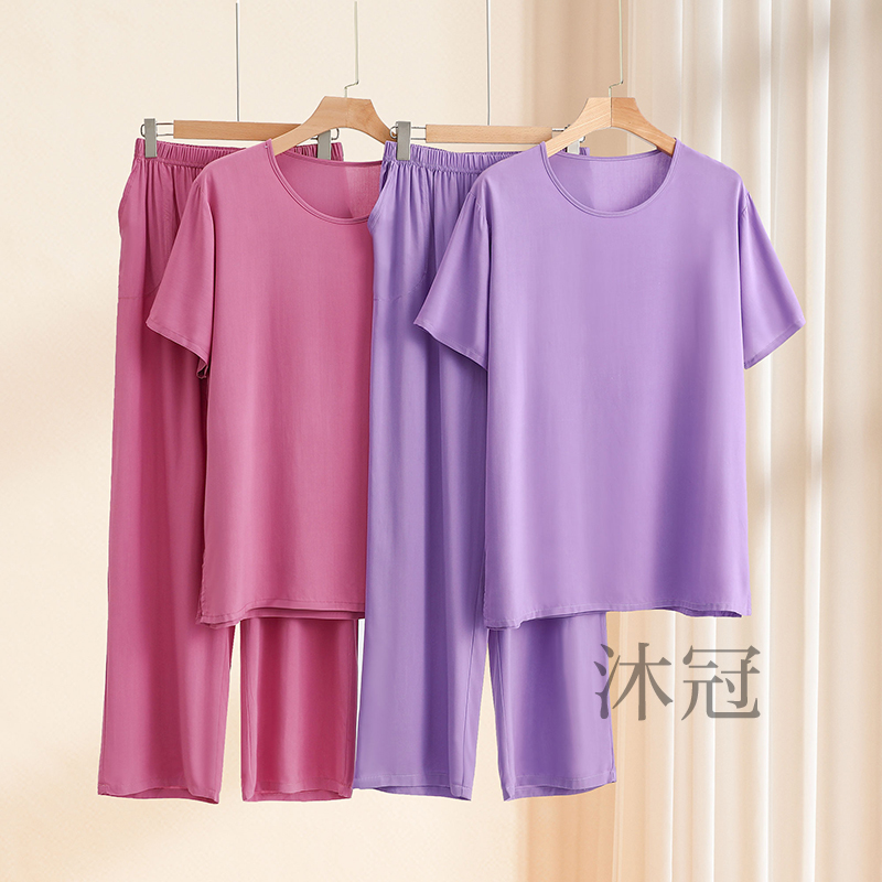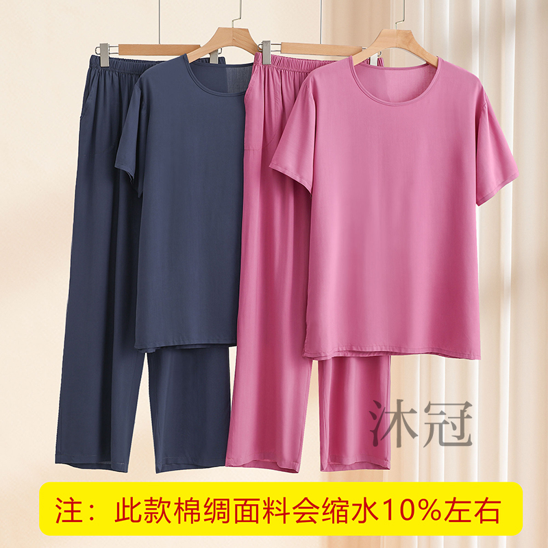 夏季绵绸睡衣套装女可外穿人造棉短袖大码上衣阔腿裤妈妈薄家居服